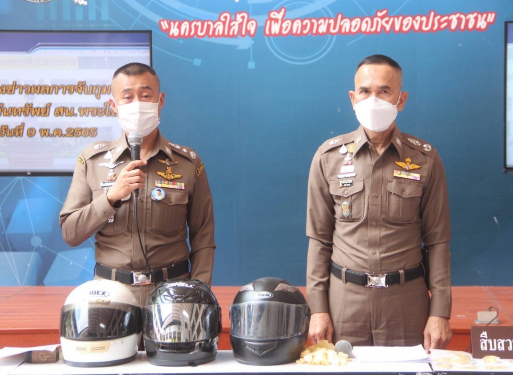 เมื่อวันที่ 6 พ.ค.65 เวลาประมาณ 22.40 น. มีกลุ่มคนร้ายชายจำนวนสามคนขับขี่รถจักรยานยนต์มาใช้อาวุธปืนปล้นเอาทรัพย์สินของตนไปจากบริเวณริมถนนหน้าหอพักเจ วรรณแมนชั่น ซอยอ่อนนุช 44 แขวงอ่อนนุช เขตสวนหลวง กรุงเทพมหานคร เจ้าหน้าที่ตำรวจ สน.พระโขนง จึงได้ออกตรวจที่เกิดเหตุ และตรวจสอบกล้องวงจรปิด พบผู้ถูกจับทั้งสามขับรถจักรยานยนต์ของกลางเข้ามาหากลุ่มผู้เสียหาย พร้อมใช้อาวุธปืนข่มขู่เอาทรัพย์สินจากผู้เสียหาย แล้วหลบหนีไปเจ้าหน้าที่ตำรวจจึงไปตรวจสอบบริเวณที่เกิดเหตุ และตรวจสอบกล้องวงจรปิดตามเส้นทางหลบหนีของคนร้าย ต่อมาวันที่ 7 พ.ค.65 เวลาประมาณ 14.00 น. ขณะทำการสืบสวนพบเห็นผู้ต้องหาทั้งสามพร้อมรถจักรยานยนต์(ของกลางรายการที่ 5) จอดอยู่บริเวณบริเวณลานจอดรถบ้านเลขที่ 100 ซอยแพตาใบ (พี่งมี 50) แขวงบางจาก เขตพระโขนง กรุงเทพมหานคร และพบเห็นผู้ถูกจับทั้งสาม ลักษณะมีพิรุธมีเหตุอันควรสงสัยว่าบุคคลนั้นมีสิ่งของผิดกฎหมายอยู่ในความครอบครอง หรือซึ่งได้มาโดยการกระทำความผิด หรือซึ่งมีไว้เป็นความผิด จึงได้แสดงตัวและขอตรวจค้น โดยก่อนการตรวจค้นได้แสดงความบริสุทธิ์ใจให้ผู้ถูกจับทั้งสามดูจนเป็นที่พอใจแล้ว จึงทำการตรวจค้น จากการตรวจค้น พบของกลางลำดับที่ 1-4 อยู่ใต้เบาะรถจักรยานยนต์ของกลางลำดับที่ 5 ตรวจยึดได้ในขณะที่จอดไว้บริเวณสถานที่จับกุม ,ของกลางรายการที่ 6-7 เป็นเสื้อผ้า,หมวกกันน็อค ที่ผู้ต้องหาที่ 1 สวมใส่ในขณะก่อเหตุ , ของกลางรายการที่ 8-10 เป็นเสื้อผ้า,หมวกกันน็อค ที่ผู้ต้องหาที่ 2 สวมใส่ในขณะก่อเหตุ ,ของกลางรายการที่ 11-13 เป็นเสื้อผ้า,หมวกกันน็อค ที่ผู้ต้องหาที่ 3 สวมใส่ในขณะก่อเหตุ ตรวจยึดได้ในขณะผู้ต้องหาสวมใส่อยู่, สอบถามเกี่ยวกับของกลาง ผู้ถูกจับทั้งสามรับว่า เข็มขัดและแหวนเป็นทรัพย์ที่ได้มาจากการปล้นทรัพย์จริง, อาวุธปืน, รถจักรยานยนต์, เสื้อผ้า, หมวกกันน็อค เป็นอุปกรณ์ที่ใช้ในการกระทำผิดจริง เมื่อนำภาพถ่ายจากกล้องวงจรปิดให้ผู้ถูกจับดูรับว่าเป็นบุคคลในภาพจริง จึงได้แจ้งข้อกล่าวหาข้างต้นให้ทราบและส่ง พงส.สน.พระโขนง ดำเนินคดีตามกฎหมายต่อไป จากตรวจสอบประวัติต้องหาคดี ทั้ง 3 คนไม่พบประวัติการต้องโทษแต่อย่างใด
