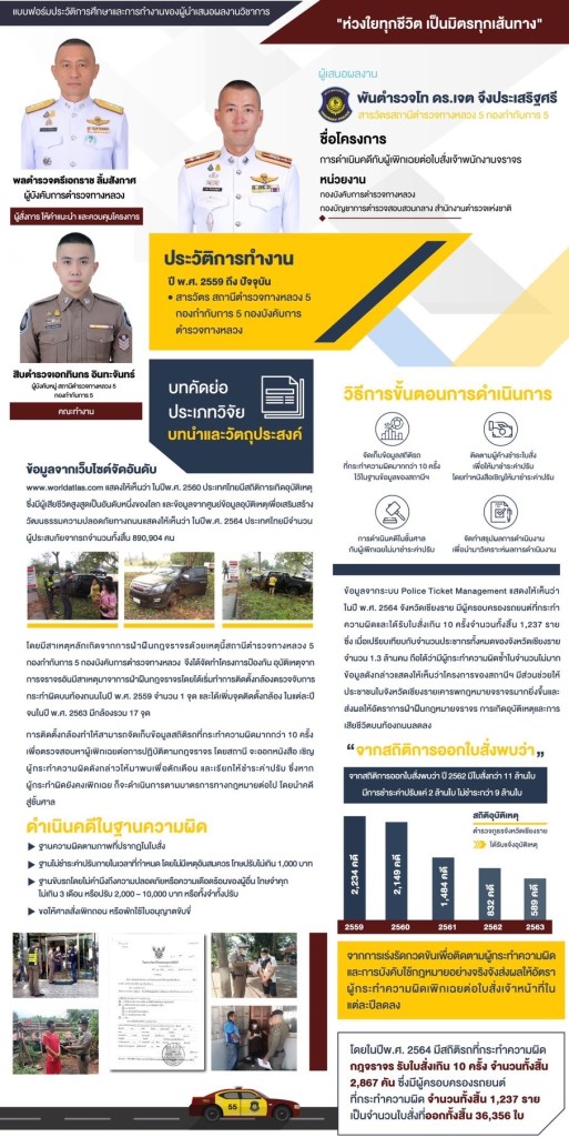 ทั้งนี้ พื้นที่นำร่องโดย พ.ต.ท.ดร.เจต จึงประเสริฐศรี สว.ส.ทล.5 กก.5 บก.ทล. ได้สั่งการให้เจ้าหน้าที่ตำรวจ ส.ทล.5 กก.5 ปฏิบัติตามนโยบายอย่างเคร่งครัด และพบว่า ข้อมูลจากระบบ Police Ticket Management แสดงให้เห็นว่า ในปี พ.ศ. 2564 จังหวัดเชียงราย มีผู้ครอบครองรถยนต์ที่กระทำความผิดและได้รับใบสั่งเกิน 10 ครั้ง จำนวนทั้งสิ้น 1,237 ราย ซึ่งเมื่อเปรียบเทียบกับจำนวนประชากรทั้งหมดของจังหวัดเชียงราย จำนวน 1.3 ล้าน คน ถือได้ว่ามีผู้กระทำความผิดซ้ำในจำนวนไม่มาก