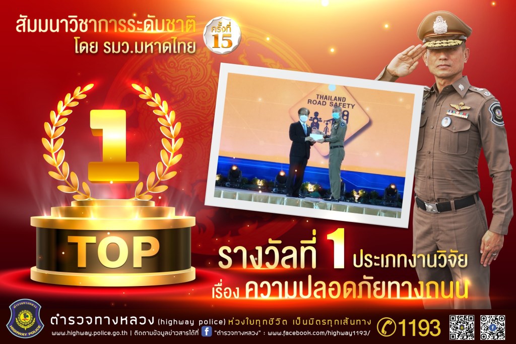 ตำรวจทางหลวงคว้ารางวัลที่ 1 งานวิจัยความปลอดภัยบนท้องถนน ในงานสัมมนาวิชาการระดับชาติครั้งที่ 15 หัวข้อ การดำเนินคดีกับผู้เพิกเฉยต่อใบสั่งเจ้าพนักงานจราจร หวังนำร่องลดอุบัติเหตุ สร้างจิตสำนึกที่ดีในการใช้รถใช้ถนนร่วมกันอย่างปลอดภัย