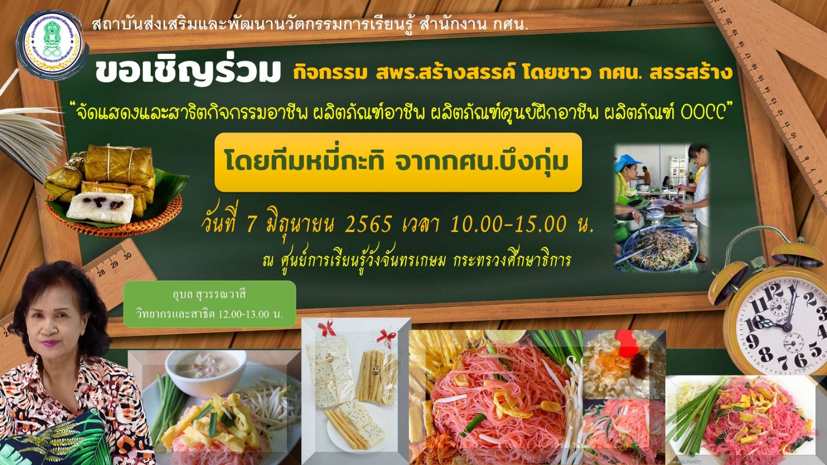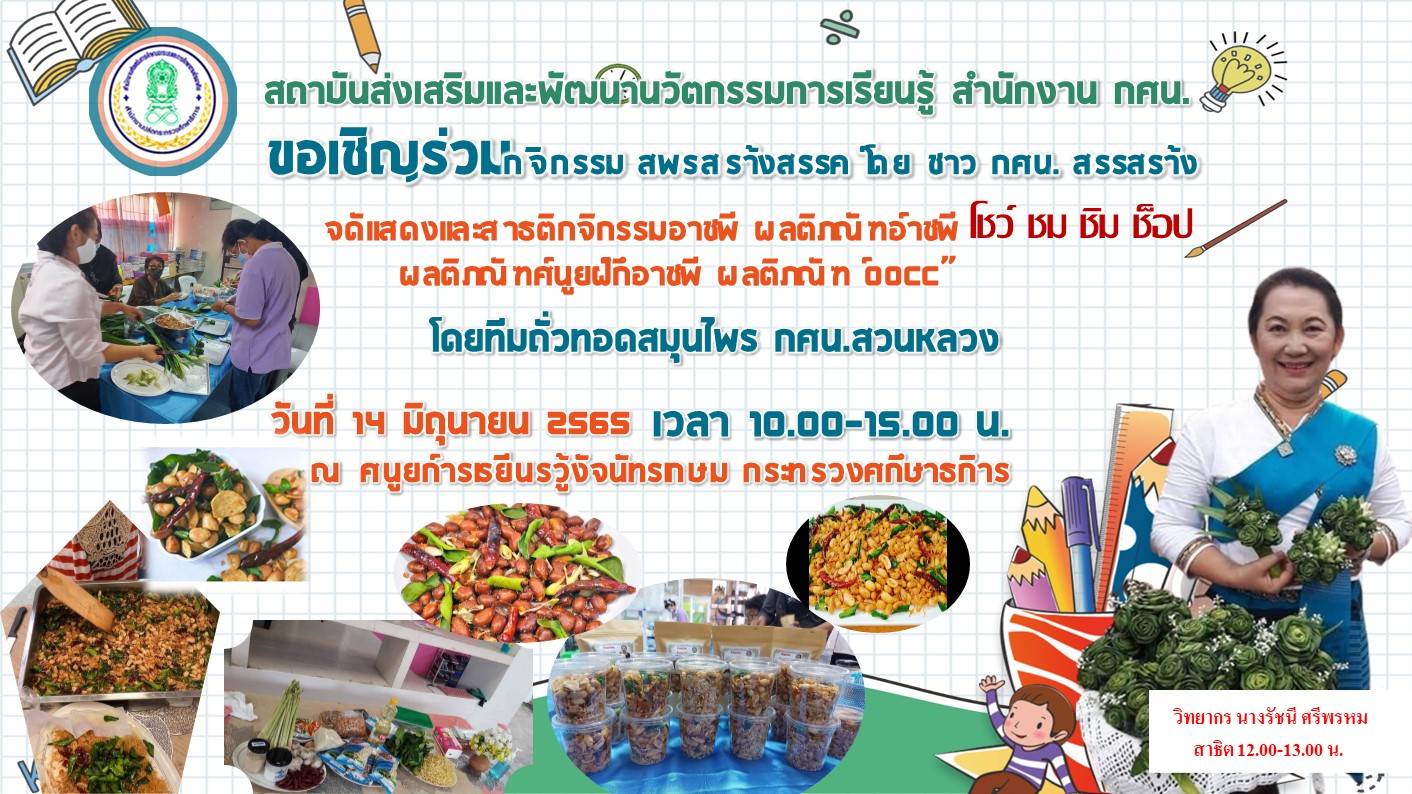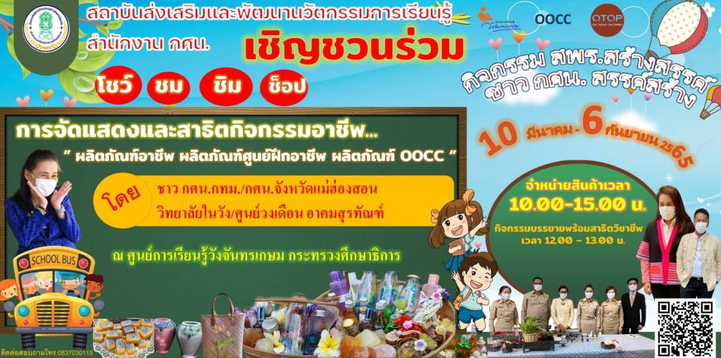 ห้ามพลาด! ชม! ชิม! ช็อป! สนับสนุนผลิตภัณฑ์ OOCC ของชาว กศน.ที่คัดสรรของดีในชุุมชนหมุนเวียนกันมาจัดแสดงพร้อมสาธิตกิจกรรมอาชีพ และจำหน่วยในราคาย่อมเยาว์…