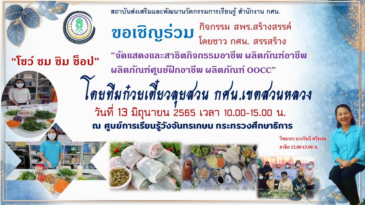 สถาบันส่งเสริมและพัฒนานวัตกรรมเรียนรู้ สำนักงาน กศน. เชิญชวนบุคลากรภายในกระทรวงศึกษาธิการ และประชาชนผู้สนใจร่วมกิจกรรมจัดแสดงและสาธิตกิจกรรมอาชีพ ผลิตภัณฑ์อาชีพ ผลิตภัณฑ์ศูนย์ฝึกอาชีพ #ผลิตภัณฑ์OOCC ภายใต้ชื่อกิจกรรม “สพร.สร้างสรรค์ โดย ชาว กศน. สรรสร้าง” ณ บริเวณหน้าศูนย์การเรียนรู้วังจันทรเกษม กระทรวงศึกษาธิการ ตั้งแต่วันนี้ – 6 กันยายน 2565 ตั้งแต่เวลา 10.00 -15.00 น. ห้ามพลาด