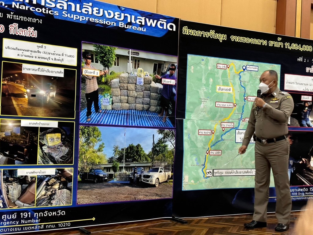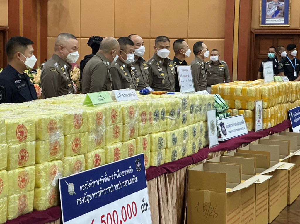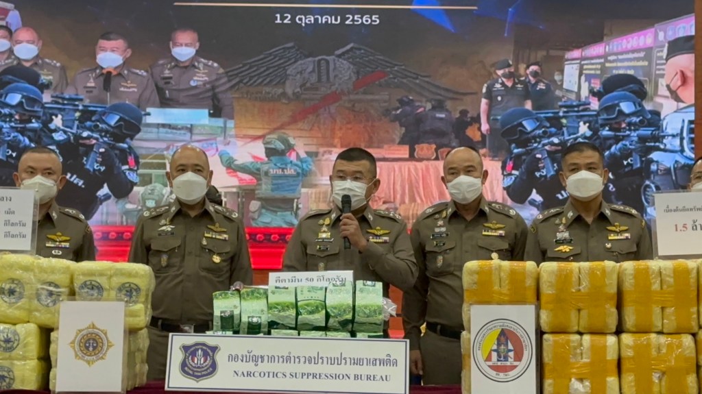 วันนี้ (12 ต.ค.65) เวลา 14.00 น. ที่ กองบัญชาการตำรวจปราบปรามยาเสพติด(บช.ปส.) พล.ต.อ.ดำรงศักดิ์ กิตติประภัสร์ ผบ.ตร. พร้อมด้วย พล.ต.อ.ชินภัทร สารสิน รอง ผบ.ตร./ผอ.ศอ.ปส.ตร., พล.ต.ท.ประจวบ วงศ์สุข ผู้ช่วย ผบ.ตร./รอง ผอ.ศอ.ปส.ตร., พล.ต.ท.สรายุทธ สงวนโภคัย ผบช.ปส. พล.ต.ต.พลัฏฐ์ วิเศษสิงห์ ผบก.สกส. พร้อมด้วยเจ้าหน้าที่ตำรวจ บก.สกส. ร่วมแถลงข่าวการจับกุมขบวนการค้ายาเสพติดรายใหญ่ 2 คดี พร้อมยาเสพติดของกลางยาบ้า 11,684,000 เม็ด คีตามีน 50 กิโลกรัม, ไอซ์ 2 กิโลกรัม และตรวจยึดทรัพย์สิน มูลค่าประมาณ 1.5 ล้านบาท พล.ต.อ.ดำรงศักดิ์ ฯ เปิดเผยว่า คดีแรก จับกุมนายตนุภัทร อนันต์สิริพิทักษ์ กับ นายสืบศักดิ์ แซ่กือ กลุ่มชาติพันธุ์ม้ง ได้บริเวณริมถนนสาย สิงห์บุรี-ลพบุรี (ทล.311) ขณะกำลังขับรถพยายามหลบหนีด่านตรวจ เพื่อลำเลียงยาเสพติดไปส่งให้กับลูกค้าในจังหวัดสระบุรี ตรวจสอบภายในรถพบ กระสอบจำนวน 33 ใบ ด้านในบรรจุยาบ้า จำนวน 6,500,000 เม็ด ห่อหุ้มด้วยกระดาษสาสีขาว จำนวน 3,250 มัด, กระเป๋า 2 ใบ ด้านในบรรจุเคตามีน น้ำหนัก 50 กก. บรรจุอยู่ในห่อขาสีเขียว จำนวน 50 ห่อ นอกจากนี้ยังยึดโทรศัพท์มือถือได้ 3 เครื่อง, เงินสด 51,000 บาท พร้อมรถของกลางที่ร่วมขบวนการ รวม 3 คัน ส่วนผู้ขับขี่รถอีก 2 คันหลบหนีอยู่ระหว่างติดตามตัวมาดำเนินคดี สอบถาม 2 ผู้ต้องหา รับว่าตนมีอาชีพ “วิ่งผัก” แต่ได้มาร่วมกับ นายเกียรติพันธ์ แซ่ซ้ง ผู้ต้องหาที่หลบหนี รับจ้างลำเลียงยาเสพติดจากพื้นที่ภาคเหนือตอนบน เพื่อส่งมอบให้กับลูกค้าในพื้นที่พระพุทธบาท จังหวัดสระบุรี ได้ค่าจ้าง 2 แสนบาท เบื้องต้นแจ้ง 2 ข้อหา “ร่วมกันกับพวกที่หลบหนี จำหน่ายโดยการมีไว้เพื่อจำหน่ายซึ่งยาเสพติดให้โทษประเภท 1 (เมทแอมเฟตามีนหรือยาบ้า) ฯ และร่วมกันกับพวกที่หลบหนี จำหน่ายโดยการมีไว้เพื่อจำหน่ายซึ่งวัตถุออกฤทธิ์ประเภท ๒ (คีตามีน) โดยไม่ได้รับอนุญาต”