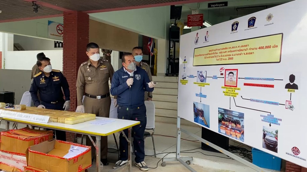 และจับกุม นายอธิวัฒน์ กลับวงศา อายุ 27 ปี หรือโอม ชาว ต.บ้านหาร อ.บางกล่ำ จ.สงขลา จากการตรวจค้นภายในบ้านเช่า พบยาบ้าจำนวน 4 แสนเม็ด มูลค่า 12 แสนบาท ซุกซ่อนอยู่ในกล่องพัสดุ จำนวน 2 กล่อง กล่องละ 100 มัดจึงยึดเอาไว้ พร้อมรถยนต์กระบะยี่ห้ออีซูซุ รุ่นดีแม็ค 4 ประตู สีบรอนซ์ทอง หมายเลขทะเบียน งจ 5884 สงขลา ซึ่งเป็นรถกระบะแต่งซิ่งเพิ่งวางเครื่องมาใหม่กว่า 3 แสนบาท
