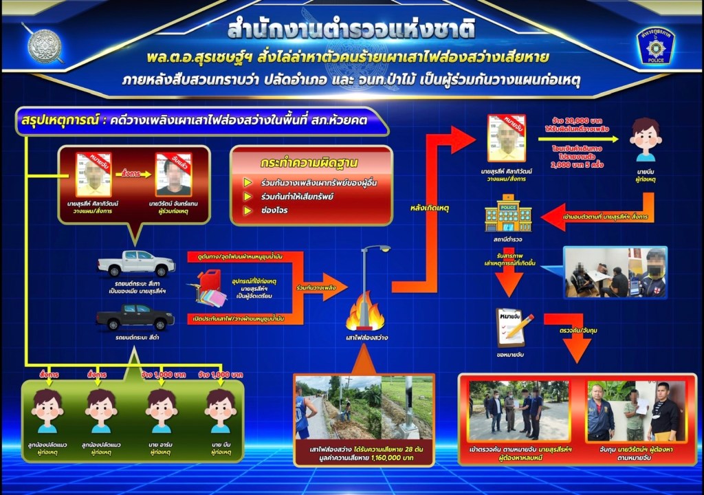 จากการสืบสวนทราบว่า หลังจากเกิดเหตุคดีเผาเสาไฟฟ้าจำนวนหลายต้น ต่อมาเมื่อวันที่ 7 มิ.ย.65 นายอนุชา หรือบีม อายุ 19 ปี ได้เดินทางมามอบตัวต่อ พงส.สภ.ห้วยคต และให้การรับสารภาพว่า เป็นผู้ ก่อเหตุวางเพลิงเผาเสาไฟฟ้าส่องสว่างดังกล่าวด้วยตนเองจริง และได้ก่อเหตุแต่เพียงผู้เดียว พงส.จึงได้แจ้งข้อกล่าวหานายอนุชาฯ หรือบีม ว่าได้กระทำความผิดฐาน “วางเพลิงเผาทรัพย์ของผู้อื่น, ทำให้เสียทรัพย์” ซึ่งจากกรณีดังกล่าว ทีมงานพนักงานสืบสวนฯ พบข้อพิรุธต้องสงสัยหลายประการ จึงได้ทำการสืบสวนขยายผลเพิ่มเติม ทำให้ทราบว่าพฤติการณ์ตามที่นายอนุชาฯ หรือบีม ให้การรับสารภาพกับ พงส.สภ.ห้วยคต ดังกล่าวนั้นไม่เป็นความจริง นำไปสู่รวบรวมพยานหลักฐานที่เกี่ยวข้องเพิ่มเติมและยื่นคำร้องต่อศาลอาญา เพื่อขออนุมัติหมายจับผู้ต้องหาที่ได้ร่วมก่อเหตุในคดีดังกล่าวเพิ่มเติม ได้แก่