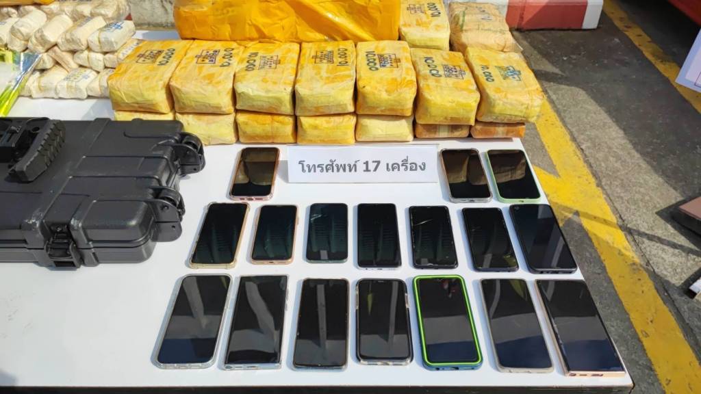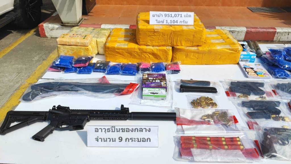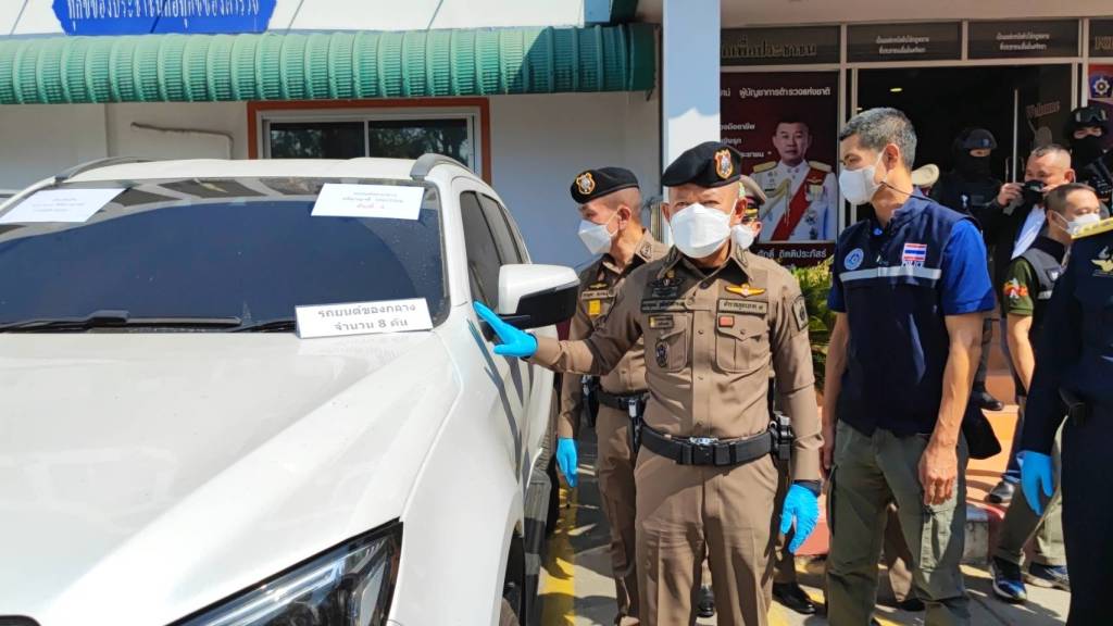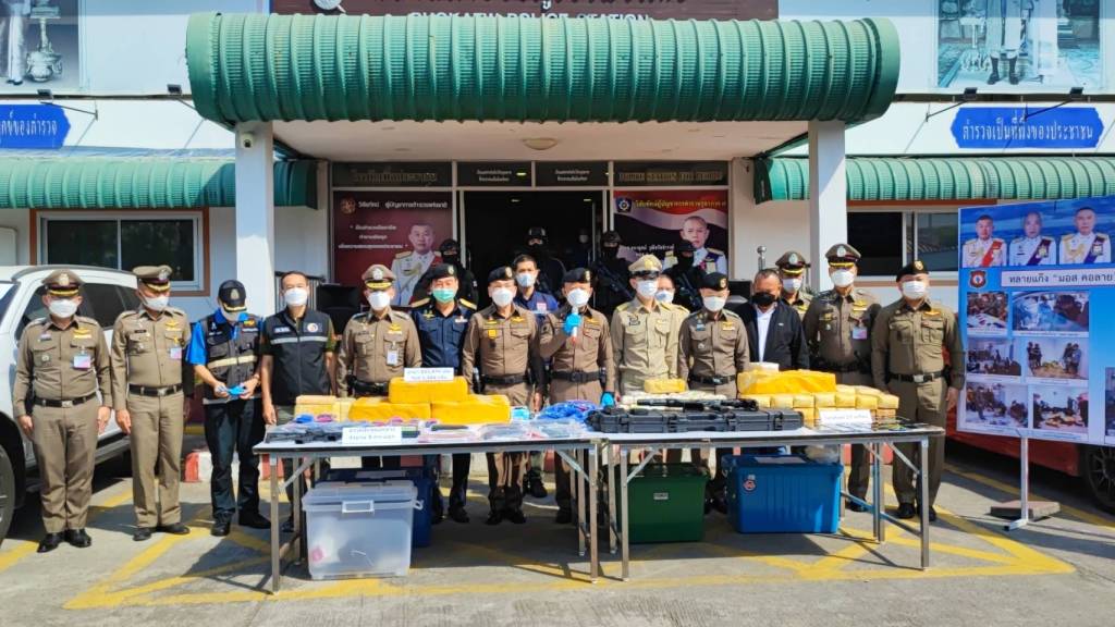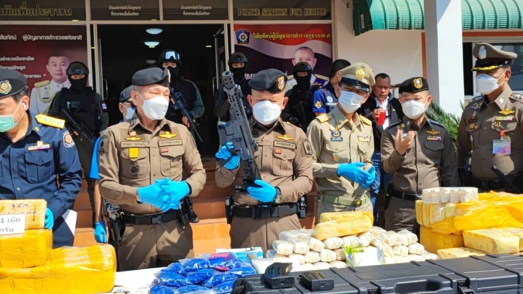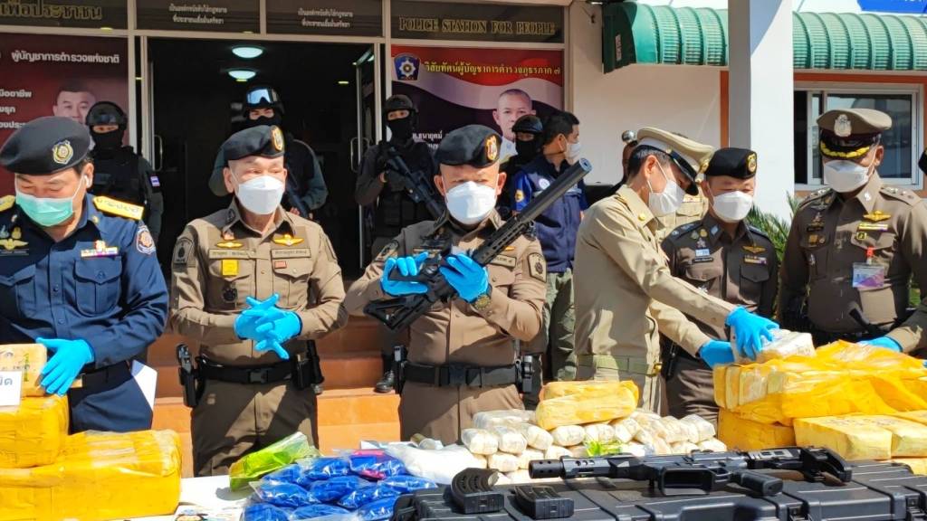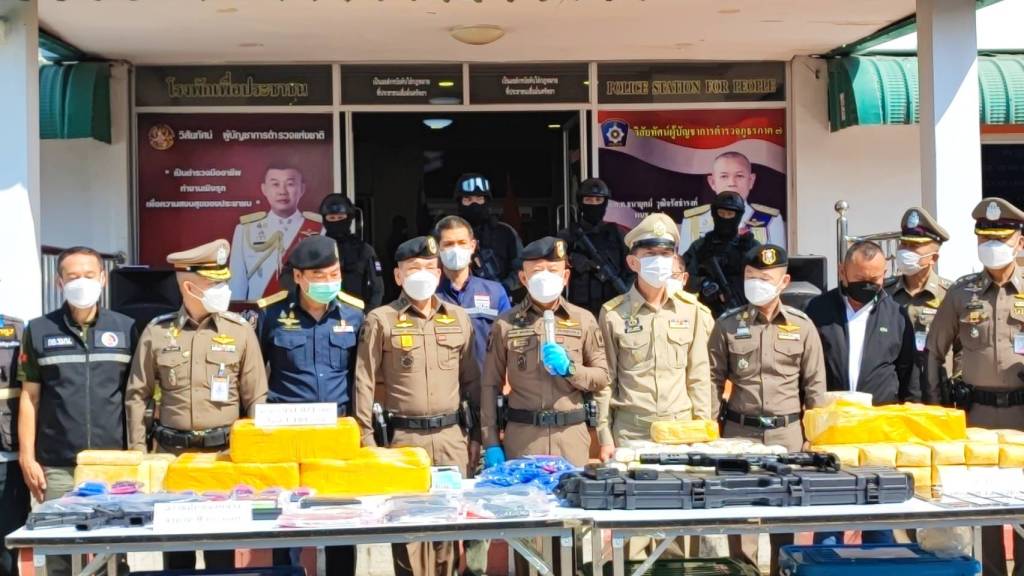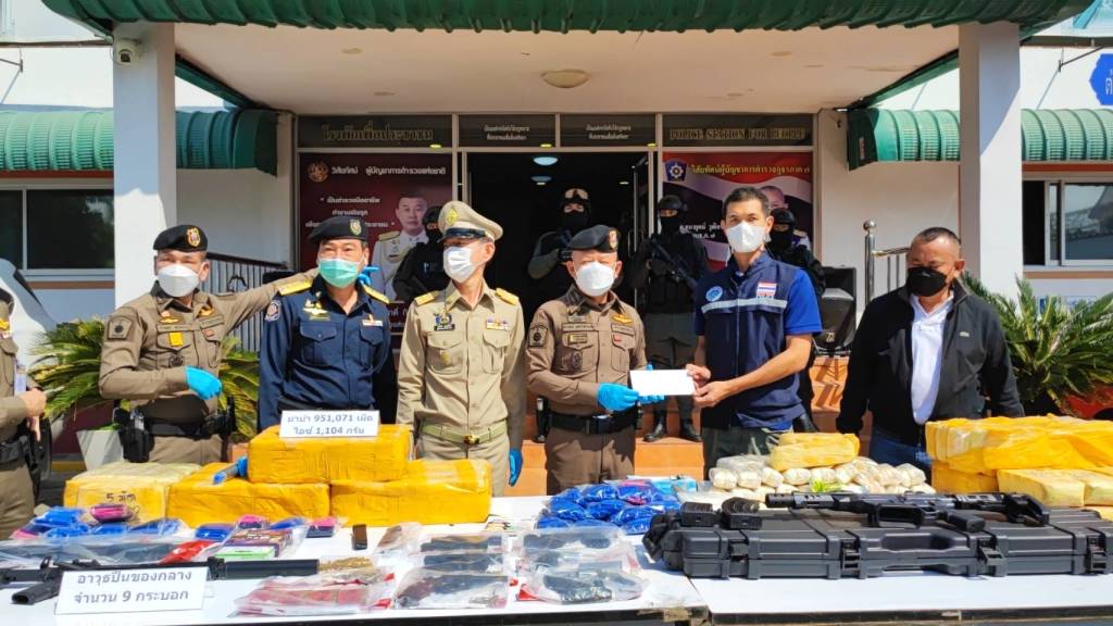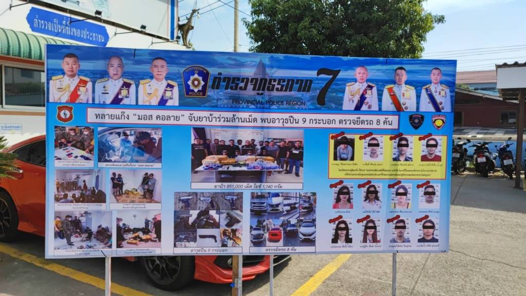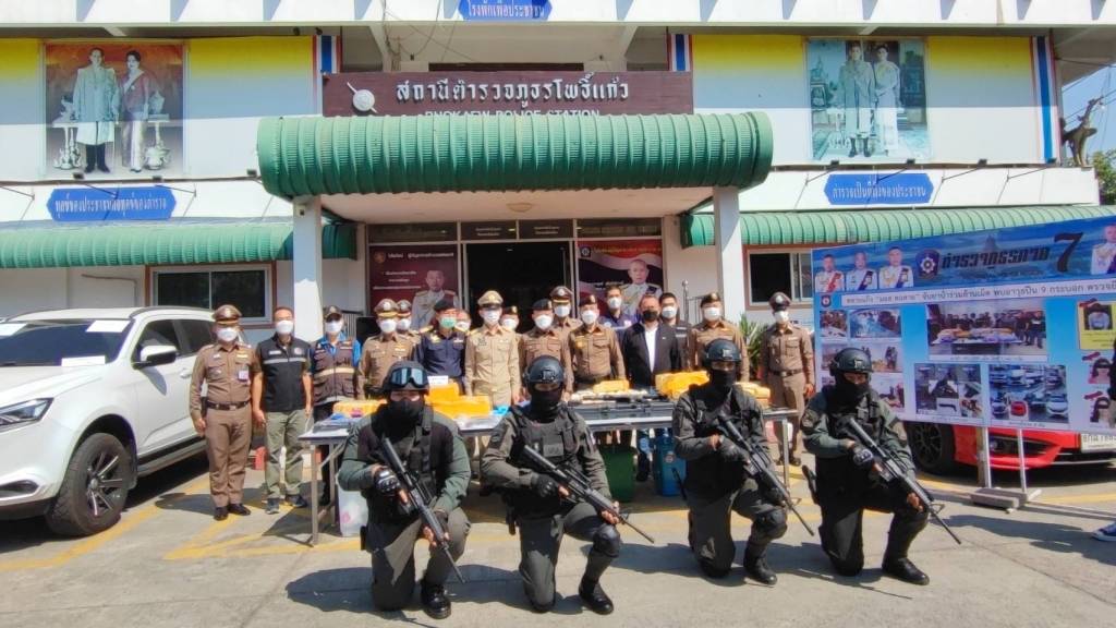 พล.ต.ท.ธนายุตม์ วุฒิจรัสธำรงค์ ผบช.ภ.7 พล.ต.ต.บุญญฤทธิ์ รอดมา รอง ผบช.ภ.7 พล.ต.ต.วรายุทธ สุขวัฒน์ รอง ผบช.ภ.7 พล.ต.ต.ชมชวิณ ปุระธนานนท์ รอง ผบช.ภ.7 พล.ต.ต.จักรกฤษ เครือสุนทรวานิช ผบก.ภ.จว.นครปฐม พล.ต.ต.ประสพชัย มัตสยะวนิชกูล ผบก.สส.ภ.7 พล.ต.ต.ปรีดา อิ่มเจริญ ผบก.ศฝร.ภ.7 พ.ต.อ.พงษกร อุปพงษ์ รอง ผบก.ภ.จว.นครปฐม พ.ต.อ.กัมปนาท ณ.วิชัย ผกก.สภ.โพธิ์แก้วเจ้าหน้าที่ชุดสืบสวน บก.สส.ภ.7 พร้อมเจ้าหน้าที่ที่เกี่ยวข้องร่วมแถลงผลการจับกุมกลุ่มขบวนการยาเสพติดรายใหญ่ผู้ต้องหาจำนวน 12 คนพร้อมของกลางยาบ้าจำนวน 475 มัด เศษ รวมประมาณ 951,000 เม็ด ไอซ์ น้ำหนักประมาณ 1,140 กรัมอาวุธปืน จำนวน 8 กระบอก รถยนต์กระบะ จำนวน 1 คัน สมุดบัญชีเงินฝาก เครื่องกระสุนปืนขนาดต่างๆ และของกลางอื่นๆจำนวนมาก