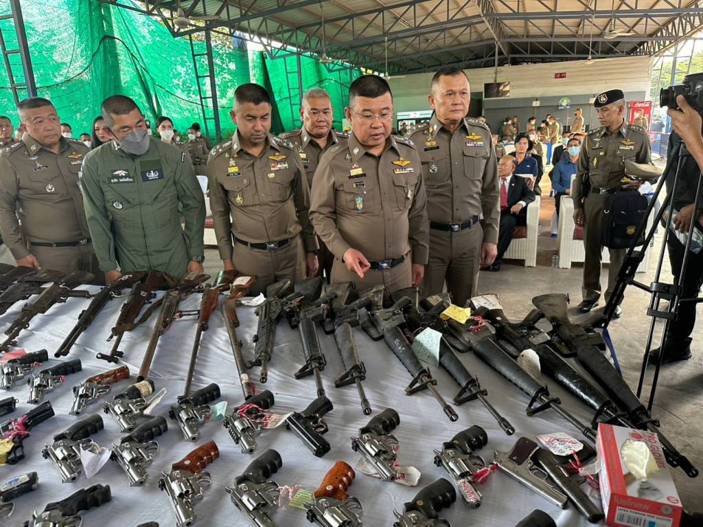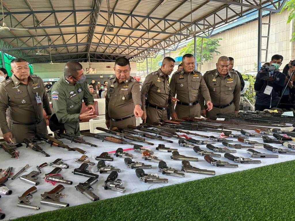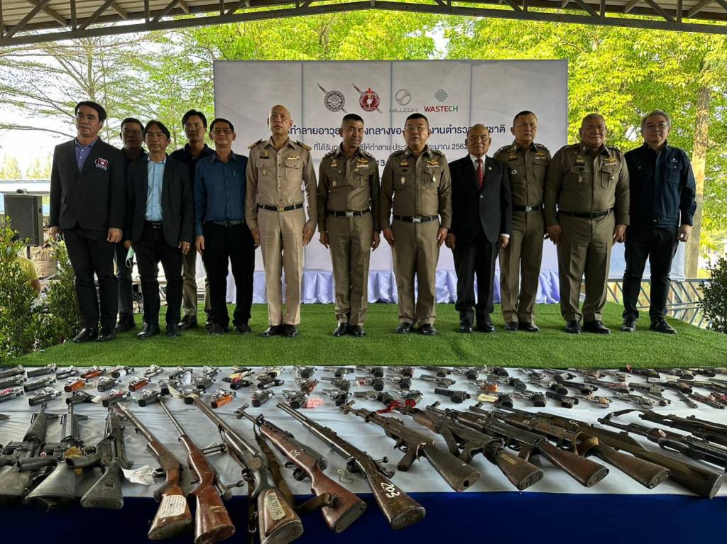 วันที่ 23 ก.พ.66 เวลา 16.00 น. พล.ต.อ.ดำรงศักดิ์ กิตติประภัสร์ ผบ.ตร. เดินทางมาเป็นประธานในพิธีทำลายอาวุธปืนของกลาง โดยมี พล.ต.อ.สุรเชษฐ์ หักพาล รอง ผบ.ตร. พล.ต.ท.อิทธิพล อิทธิสารรณชัย ผบช.ภ.2 พล.ต.ท.กฤษฎา สุรเชษฐพงษ์. ผบช.สกบ. พล.ต.ต.พงษ์พันธ์ วงศ์มณีเทศ ผบก.ภ.ระยอง เข้าร่วมพิธีเป็นสักขีพยาน ณ บริษัท มิลล์คอน สตีล จำกัด (มหาชน) อ.นิคมพัฒนา จ.ระยอง การจัดพิธีในครั้งนี้ สืบเนื่องจากตามนโยบาย พล.อ.ประยุทธ์ จันทร์โอชา นายกรัฐมนตรี ให้สำนักงานตำรวจแห่งชาติดำเนินมาตรการปราบปรามอาวุธปืนผิดกฎหมายทุกมิติ เพื่อสร้างความปลอดภัยในชีวิตและทรัพย์สินของประชาชน พล.ต.อ.ดำรงศักดิ์ กิตติประภัสร์ ผบ.ตร. ได้ขับเคลื่อนตามนโยบายดังกล่าว ได้สั่งการหน่วยระดมกวาดล้างจับกุม ขยายผล ทลายเครือข่ายอาวุธปืนผิดกฎหมาย รวมทั้งการลักลอบค้าปืนออนไลน์ พร้อมกำชับการจำหน่าย ทำลายอาวุธปืนของกลาง เพื่อป้องกันมิให้มีการนำเอาอาวุธปืนดังกล่าวกลับมาใช้ก่อเหตุในคดีอาญา หรือลักลอบจำหน่ายไปยังบุคคลไม่หวังดี ตกอยู่ในมือของคนร้าย รวมทั้งเป็นการสร้างความเชื่อมั่นให้พี่น้องประชาชนด้วย ผบ.ตร.จึงมอบหมายให้ พล.ต.อ.สุรเชษฐ์ หักพาล รอง ผบ.ตร. รับผิดชอบการทำลายอาวุธปืนของกลางซึ่ง พล.ต.อ.สุรเชษฐ์ ได้สั่งการให้ สำนักงานส่งกำลังบำรุง โดยกรมสรรพาวุธ สำรวจอาวุธปืนของกลางที่เก็บรักษาไว้ตามคำสั่งศาลเพื่อรอทำลาย และให้สถานีตำรวจทั่วประเทศสำรวจอาวุธปืนของกลางตามระเบียบที่หน่วยงานระดับสถานีสามารถทำลายได้เองเพิ่มเติมอีกด้วย โดยพิธีทำลายอาวุธปืนของกลางของสำนักงานตำรวจแห่งชาตินั้น เป็นการนำเอาอาวุธปืนของกลางซึ่งศาลได้มีคำพิพากษาให้ริบเป็นของกลางและคดีถึงที่สุดแล้ว โดยถูกเก็บรักษาไว้ที่กองสรรพาวุธ แล้วขออนุมัติเพื่อจัดพิธีทำลายอาวุธปืนของกลาง โดยจะใช้วิธีการทำลายผ่านเครื่องจักรบดอัดให้เสียสภาพ แล้วนำไปหลอมในเตาหลอมอุณหภูมิสูง เพื่อให้อาวุธปืนของกลางทั้งหมดสิ้นสภาพที่จะนำมาใช้งานได้ โดยในครั้งนี้ได้รับความอนุเคราะห์จาก บริษัท มิลล์คอน สตีล จำกัด (มหาชน) สนับสนุนเครื่องจักรคุณภาพสูงในการหลอมโลหะด้วยอุณหภูมิสูง มีอาวุธปืนของกลางที่จะเข้าสู่กระบวนการหลอมทำลายจำนวน 13,559 กระบอก นอกจากนี้ยังมีอาวุธปืนอีกส่วนหนึ่งที่เข้าระเบียบที่หน่วยงานระดับสถานีสามารถทำลายได้เอง และมีการดำเนินการทำลายไปแล้วในช่วงระหว่างวันที่ 1 ต.ค.65 ถึง 31 ม.ค.66 อีกจำนวน 7,176 กระบอก รวมจำนวนอาวุธปืนที่ทำลายทั้งสิ้น 20,735 กระบอก ผบ.ตร. กล่าวว่า “พิธีทำลายอาวุธปืนของกลางครั้งนี้ จำนวน 20,735 กระบอก เ