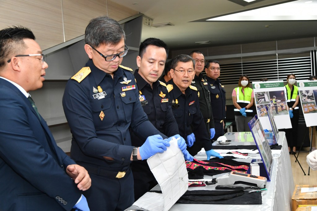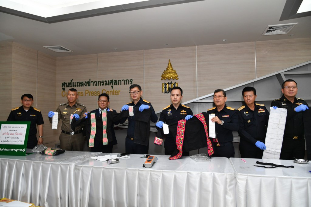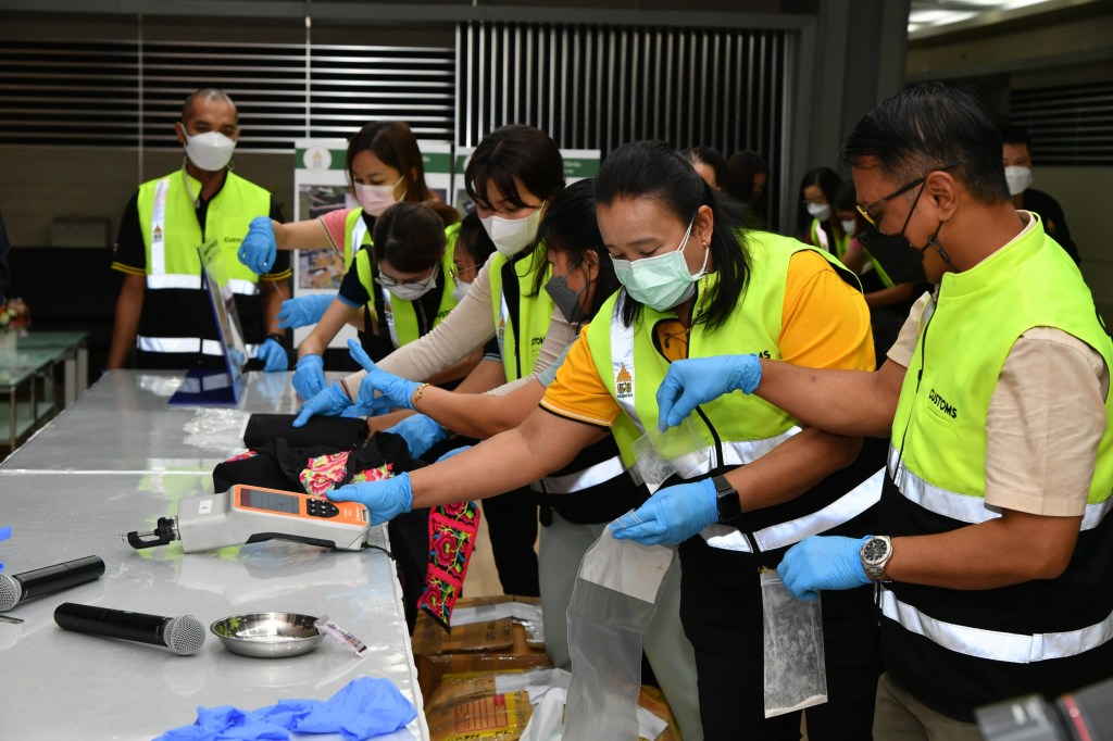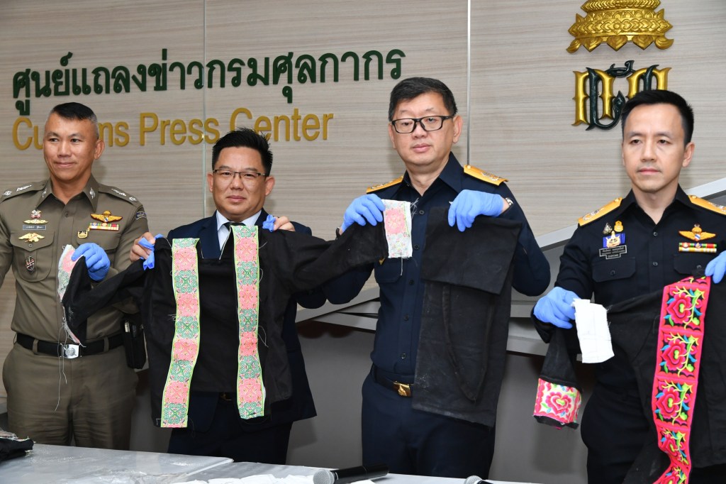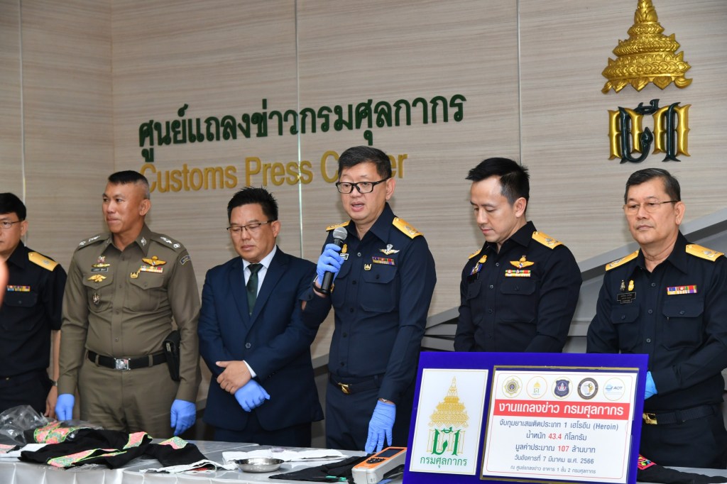 โดยเมื่อวันที่ 6 มีนาคม 2566 กรมศุลกากร โดยสำนักงานศุลกากรตรวจสินค้าท่าอากาศยานสุวรรณภูมิ ภายใต้การปฏิบัติงานของชุด AITF (AIRPORT INTERDICTION TASK FORCE) ประกอบด้วย เจ้าหน้าที่สำนักงานคณะกรรมการป้องกันและปราบปรามยาเสพติด กองบัญชาการตำรวจปราบปรามยาเสพติด และศูนย์รักษาความปลอดภัยแห่งชาติ ได้ประมวลข้อมูลเกี่ยวกับความเสี่ยงในการลักลอบนำยาเสพติดออกนอกราชอาณาจักร พบพัสดุต้องสงสัยเตรียมส่ง HONG KONG จำนวน 29 หีบห่อ สำแดงสินค้าเป็นของใช้ตามบ้านเรือน เสื้อผ้า เครื่องสำอาง เครื่องประดับ และเครื่องขจัดขน ซึ่งจากการเปิดตรวจสินค้าที่เป็นเสื้อผ้าชาวเขาและผ้าเตี่ยว จำนวน 6 หีบห่อ พบว่าบริเวณปลายแขนเสื้อทั้งสองข้างมีความหนาผิดปกติและมีกลิ่นฉุน จึงทำการเลาะตะเข็บแขนเสื้อและผ้าเตี่ยวออก พบสารที่มีลักษณะเป็นผงบรรจุอยู่ในแถบผ้าดิบที่มีการเย็บติดกับแขนเสื้อและผ้าเตี่ยว จากนั้นจึงนำวัตถุต้องสงสัยมาทดสอบเบื้องต้นด้วยน้ำยาเคมี (ONCB 051 Marquis Reagent) และเครื่อง Handheld Raman Spectrometer แสดงผลเป็นยาเสพติดให้โทษประเภท 1 เฮโรอีน (HEROIN) น้ำหนักของยาเสพติด 43.40 กิโลกรัม มูลค่า 107,500,000.00 บาท