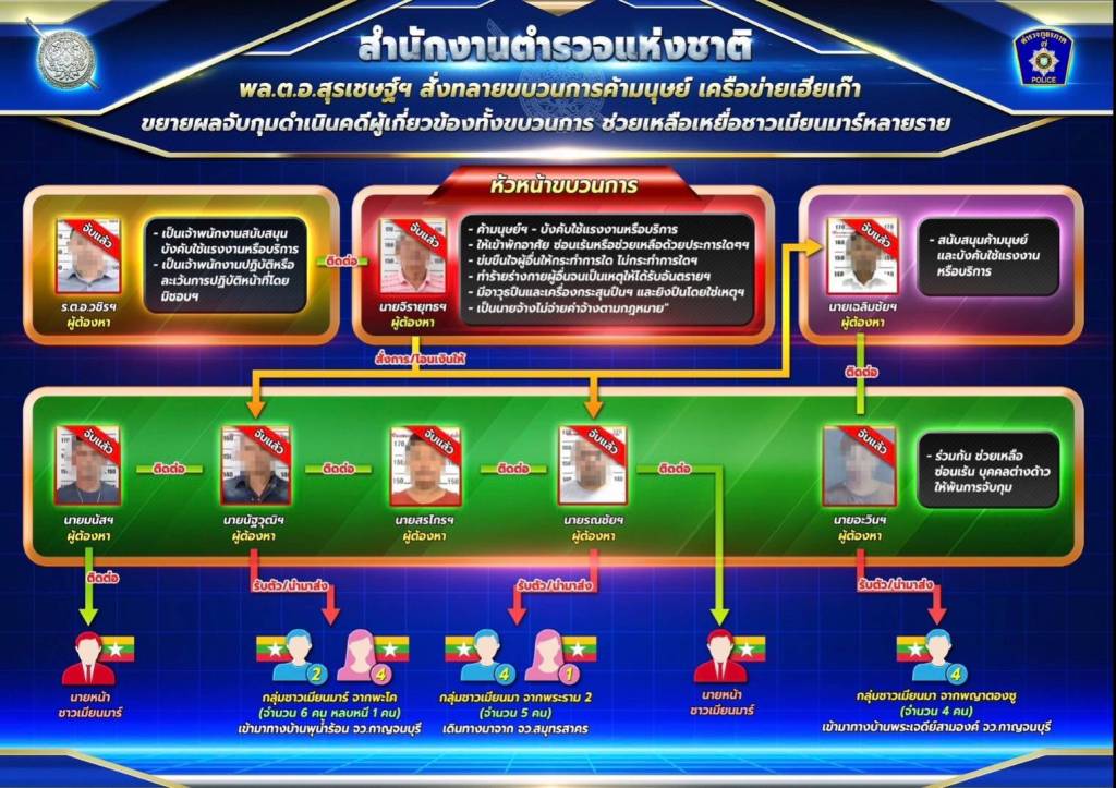 จากกรณีเมื่อวันที่ 1 มี.ค.66 เจ้าหน้าที่ตำรวจ สภ.เมืองกาญจนบุรี พร้อมด้วยเจ้าหน้าที่ที่เกี่ยวข้อง และมูลนิธิเพื่อสิทธิมนุษยชนและพัฒนา ได้ร่วมกันเข้าช่วยเหลือแรงงานชาวเมียนมาจำนวน 14 ราย หลังแจ้งขอความช่วยเหลือกรณีถูกหลอกมาทำงานตัดอ้อย และถูกนายจ้างยึดเอกสารหนังสือเดินทางและโทรศัพท์มือถือ รวมทั้งถูกทำร้ายร่างกายและบังคับให้ทำงาน โดยมีสภาพความเป็นอยู่ที่ยากลำบาก เหตุเกิดที่ไร่อ้อยภายในพื้นที่หมู่ 5 ต.บ้านเก่า อ.เมือง จ.กาญจนบุรี ซึ่งเจ้าหน้าที่สามารถช่วยเหลือแรงงานทั้งหมดได้พร้อมดำเนินคดีกับนายจ้าง ตามที่สื่อมวลชนและโซเชียลมีเดียได้นำเสนอไปแล้วนั้น กรณีดังกล่าว พล.ต.อ.สุรเชษฐ์ หักพาล รอง ผบ.ตร. ในฐานะ ผอ.ศพดส.ตร. ได้สั่งการให้ สภ.เมืองกาญจนบุรี ดำเนินการสืบสวนรวบรวมพยานหลักฐานดำเนินคดีในความผิดฐานค้ามนุษย์ รวมทั้งสืบสวนขยายผลดำเนินคดีกับผู้เกี่ยวข้องทั้งกระบวนการให้ครบถ้วน จากการสืบสวนพบว่า นายจิรายุทธ เฉลิมศุภเศรษฐ์ นายจ้าง ได้รับแรงงานต่างด้าวเข้ามาทำงานจากผู้รับจ้างขนแรงงานผิดกฎหมาย จากนั้นได้บังคับให้ทำงานในไร่อ้อย โดยยึดเอกสารประจำตัวทั้งหมด และมีการข่มขู่โดยใช้ทั้งอาวุธมีดและอาวุธปืน ทำให้แรงงานหวาดกลัวและยอมทำงาน โดยต้องทำงานทุกวันไม่มีวันหยุด และได้เงินสัปดาห์ละ 500 บาทต่อคน และต้องพักอาศัยด้วยกันอย่างแออัด เจ้าหน้าที่ตำรวจจึงได้รวบรวมพยานหลักฐานดำเนินคดีกับผู้ต้องหารวมจำนวน 9 คน แบ่งเป็นนายจ้าง 1 ราย ผู้สนับสนุน 2 ราย และคนนำพาต่างด้าวเขามาทำงานจำนวน 6 ราย ประกอบด้วย 1. นายจิรายุทธ เฉลิมศุภเศรษฐ์ (นายจ้าง) ดำเนินคดีฐาน ค้ามนุษย์ และบังคับใช้แรงงานหรือบริการฯ 2. นายเฉลิมชัย แบนดอนไพร (ผู้ใหญ่บ้าน) 3. ร.ต.อ.วชิร ชยธวัช (ลูกเขยของนายจิรายุทธฯ) ดำเนินคดีฐาน เป็นผู้สนับสนุนค้ามนุษย์และบังคับใช้แรงงานหรือบริการฯ 4. นายสรไกร ศรีนานา 5. นายนัฐวุฒิ วินกล่อม 6. นายมนัส ทองเถาว์ 7. นายเฉลิมชัย แบนดอนไพร 8. นายรณชัย เกิดสนอง 9. นายอะวิน ไม่มีนามสกุล (สัญชาติเมียนมา) ดำเนินคดีฐาน ซ่อนเร้นหรือช่วยด้วยประการใดๆ เพื่อให้คนต่างด้าวที่เข้ามาในราชอาณาจักรโดยฝ่าฝืนกฎหมายนั้นพ้นจากการจับกุม เบื้องต้นในส่วนของการดำเนินคดีกับคนนำพาทั้ง 6 รายนั้น ได้แยกดำเนินคดีเป็นอีกสำนวนหนึ่ง และได้สรุปสำนวนส่งพนักงานอัยการแล้ว ส่วนการดำเนินคดีกับนายจ้างและผู้สนับสนุนนั้น อยู่ระหว่างสรุปสำนวนเตรียมส่งพนักงานอัยการ โดยแยกส่งสำนวนของเจ้าหน้าที่รัฐให้กับพนักงานอัยการพิเศษคดีปราบปรามการทุจริต พล.ต.อ.สุรเชษฐ์ฯ 