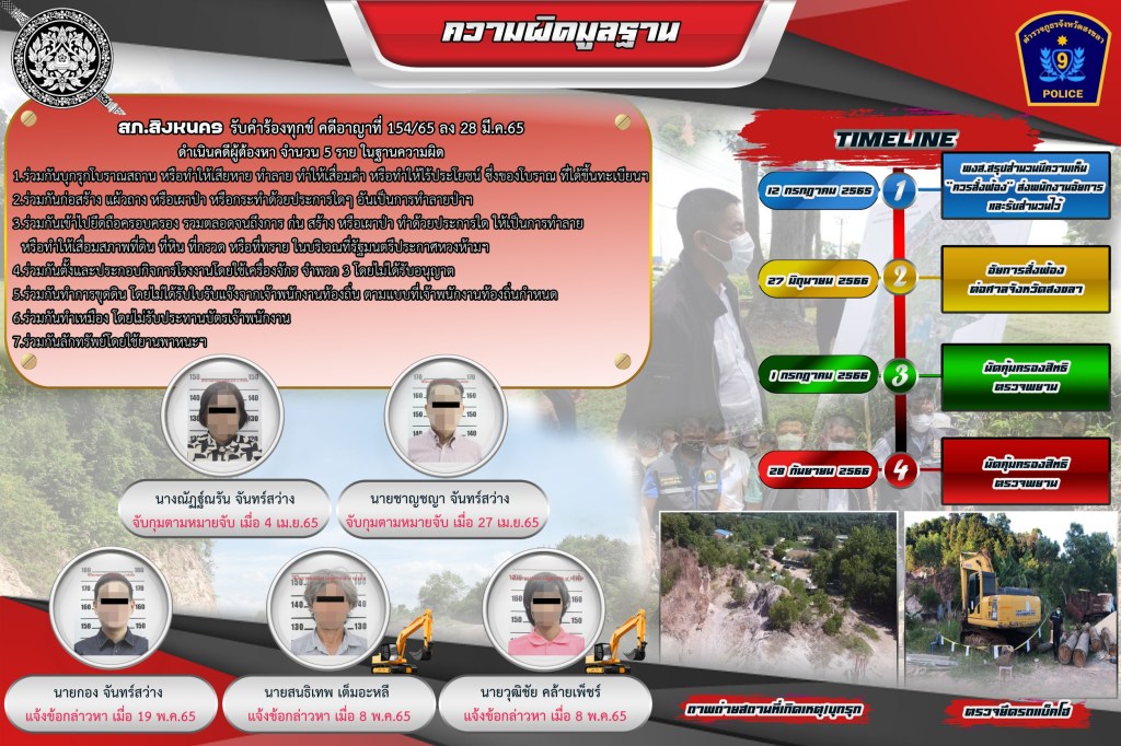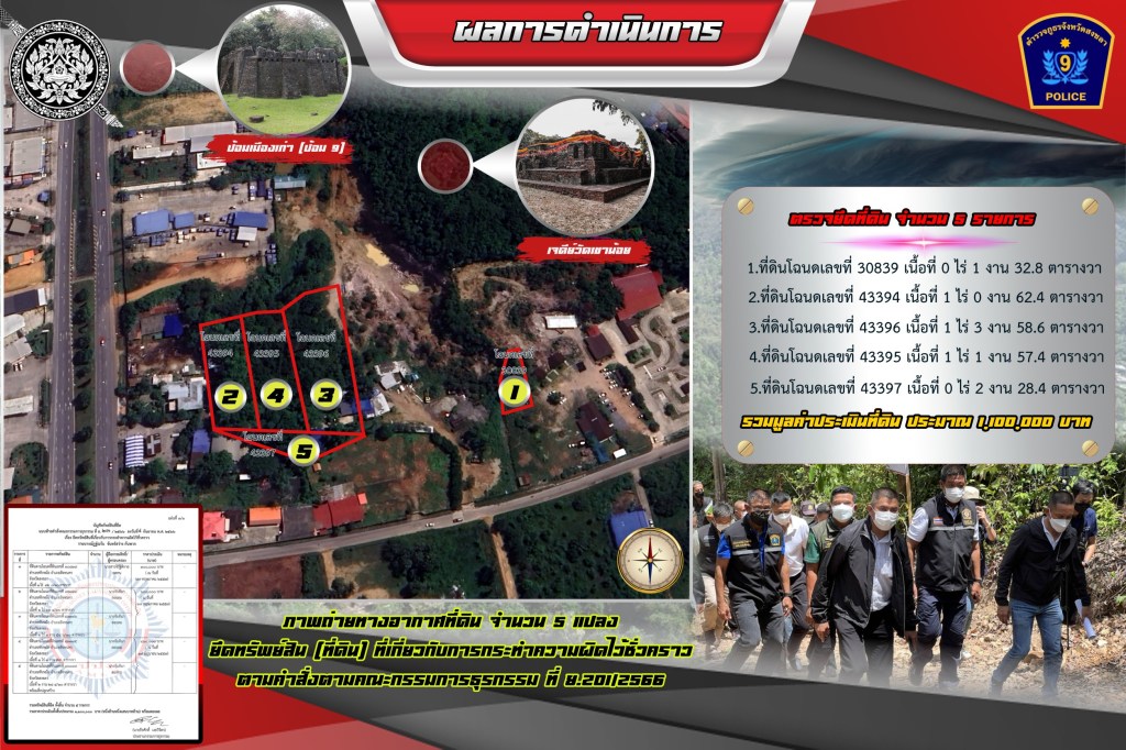 พร้อมตรวจยึด รถแบ็คโฮ ยี่ห้อโคมัทสุ สีเหลือง จำนวน 1 คัน ดำเนินคดีในฐานความผิด 7 ข้อหา ได้แก่ (1.)ร่วมกันบุกรุกโบราณสถาน พรบ.โบราณสถานฯ (2.)ร่วมกันก่อสร้าง แผ้วถาง หรือเผาป่า หรือกระทำด้วยประการใดๆ อันเป็นการทำลายป่าฯ พรบ.ป่าไม้ฯ (3.)ร่วมกันเข้าไปยึดถือครอบครอง…ก่น สร้าง หรือ…ทำด้วยประการใด ทำลาย หรือทำให้เสื่อมสภาพที่ดิน ที่หิน ที่กรวด หรือที่ทราย ป.ที่ดินฯ (4.)ร่วมกันตั้งและประกอบกิจการโรงงานจำพวกที่ 3 โดยไม่ได้รับอนุญาต พรบ.โรงงานฯ (5.)ร่วมกันทำการขุดดิน โดยไม่ได้รับใบรับแจ้งจากเจ้าพนักงานท้องถิ่น พรบ.การขุดดินฯ (6.) ร่วมกันทำเหมือง โดยไม่รับประทานบัตรเจ้าพนักงาน พรบ.แร่ฯ และ (7.)ร่วมกันลักทรัพย์โดยใช้ยานพาหนะฯ ป.อาญาฯ