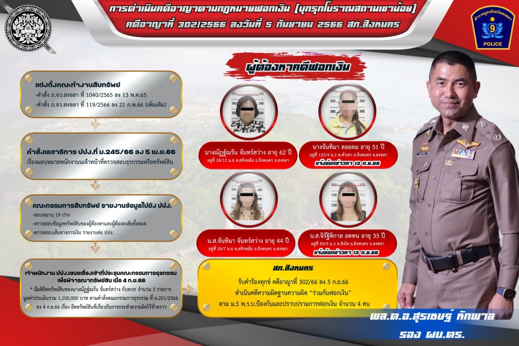 นอกจากนี้ ภ.จว.สงขลา ได้ตั้งคณะทำงานสืบทรัพย์ดำเนินการตรวจสอบทรัพย์สินของ นางณัฏฐ์ณรัน หรือเจ้อ้อย จันทร์สว่าง กับพวก รายงานไปยังเลขาธิการ ปปง. ซึ่งคณะกรรมการธุรกรรม ปปง. มีมติให้ยึดทรัพย์สิน(ที่ดิน) จำนวน 5 แปลง ตามคำสั่งที่ ย.201/2566 ลง 4 ก.ย.66 มูลค่าประเมินรวมประมาณ 1.1 ล้านบาท และสภ.สิงหนคร ได้รวบรวมหลักฐานดำเนินคดีกับผู้ต้องหากับพวกเพิ่มเติม จำนวน 4 ราย ดังนี้