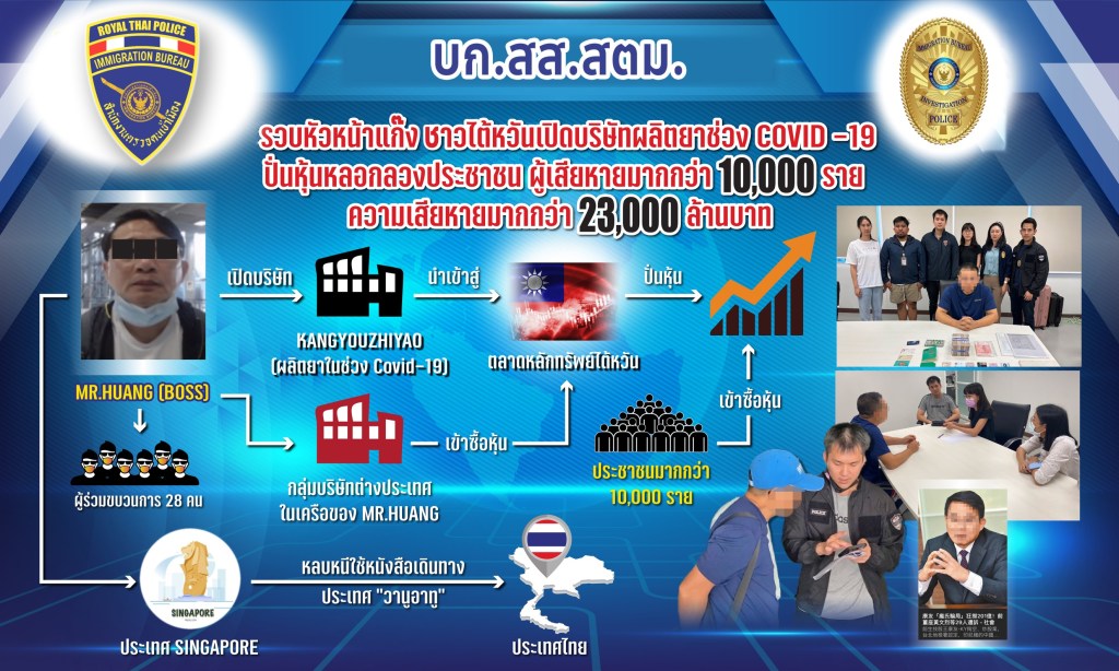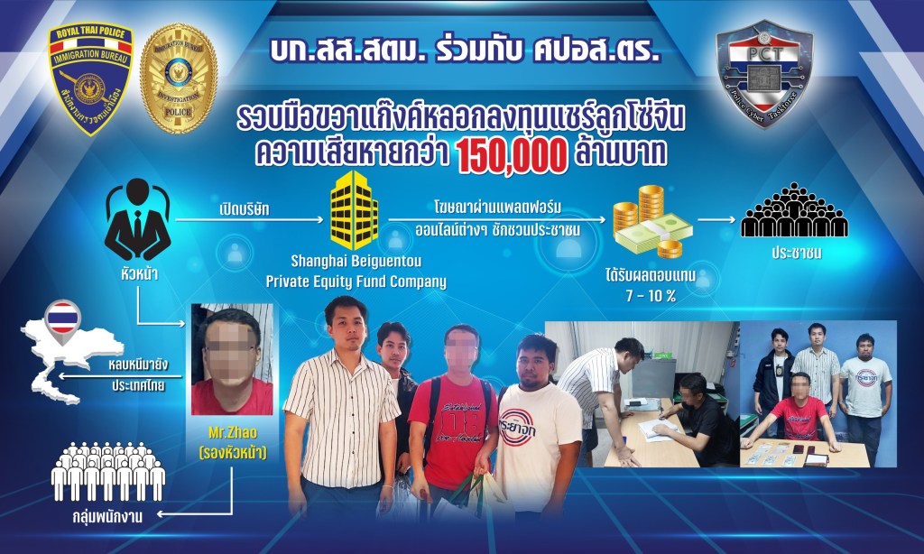 ต่อมาวันที่ 24 พ.ค.66 เวลาประมาณ 08.00 น. เจ้าหน้าที่ตำรวจไซเบอร์โดยการนำของพล.ต.ท.วรวัฒน์ วัฒน์นครบัญชา ผบช.สอท., พล.ต.ต.วิวัฒน์ คำชำนาญ รอง ผบช.สอท., พล.ต.ต.อำนาจ ไตรพจน์ รอง ผบช.สอท. พล.ต.ต.สถิตย์ พรมอุทัย ผบก.สอท.3 พล.ต.ต.ชูศักดิ์ ขนาดนิด ผบก.ตอท. ได้ประสานความร่วมมือกับ กระทรวงดิจิทัลเพื่อเศรษฐกิจและสังคม ,สำนักงานคณะกรรมการ การรักษาความมั่นคงปลอดภัยไซเบอร์แห่งชาติ (สกมช.) ,สำนักงานคณะกรรมการกระจายเสียงกิจการโทรทัศน์ และกิจการโทรคมนาคมแห่งชาติ (กสทช.) ,ผู้ให้บริการเครือข่าย AIS TRUE และ DTAC, ธนาคารกสิกรไทย และ ศูนย์ประสานงานการรักษาความมั่นคงปลอดภัยเทคโนโลยีสารสนเทศภาคธนาคาร (TB-CERT) ทำการสืบสวน ตรวจค้น จับกุมกลุ่มขบวนการดังกล่าว โดยจับกุม นายสุขสันต์ อายุ 40 ปี กับพวก รวม 6 คน ในข้อหา “ร่วมกัน ทํา มี ใช้ นําเข้า นําออก หรือค้าซึ่งเครื่องวิทยุคมนาคม โดยไม่ได้รับใบอนุญาตจากเจ้าพนักงานผู้ออกใบอนุญาต ตามมาตรา 6 พระราชบัญญัติวิทยุคมนาคม พ.ศ.2498, ร่วมกันตั้งสถานีวิทยุคมนาคม โดยไม่ได้รับใบอนุญาตจากเจ้าพนักงานผู้ออกใบอนุญาตตามมาตรา 11 พระราชบัญญัติวิทยุคมนาคม พ.ศ.2498, ร่วมกันใช้คลื่นความถี่ในการประกอบกิจการโทรคมนาคม โดยไม่ได้รับอนุญาตอันมีลักษณะที่เป็นการประกอบกิจการโทรคมนาคมแบบที่สาม ตามมาตรา 67(3) ตามพระราชบัญญัติการประกอบกิจการโทรคมนาคม, เป็นอั้งยี่หรือซ่องโจรตามประมวลกฎหมายอาญา” ตรวจยึดรถยนต์ที่ติดตั้งเครื่องจำลองสถานีฐาน (False Base Station) จำนวน 4 คัน พร้อมอุปกรณ์ 4 ชุด ตรวจยึดเครื่องจำลองสถานีฐาน (False Base Station) ที่ยังไม่ได้แกะออกมาใช้อีก 1 ชุด ในชั้นจับกุมผู้ต้องหาให้การรับสารภาพตลอดข้อกล่าวหา โดยให้การรับว่าได้รับการติดต่อว่าจ้างจากคนรู้จักที่ทำงานอยู่ประเทศเพื่อนบ้านขับรถนำเครื่องจำลองสถานีฐาน (False Base Station) ส่งข้อความสั้น (SMS) หลอกลวงประชาชนในรัศมี 2 กม. หรือครอบคลุมพื้นที่ 4 ตร.กม. โดยจะได้ค่าจ้างสำหรับการวิ่งส่งสัญญาณเดือนละ 80,000 บาท ซึ่งเครื่องดังกล่าวนั้นสามารถส่งสัญญาณไปยังโทรศัพท์ที่อยู่บริเวณใกล้เคียงได้วันละ 20,000 หมายเลขต่อเครื่อง