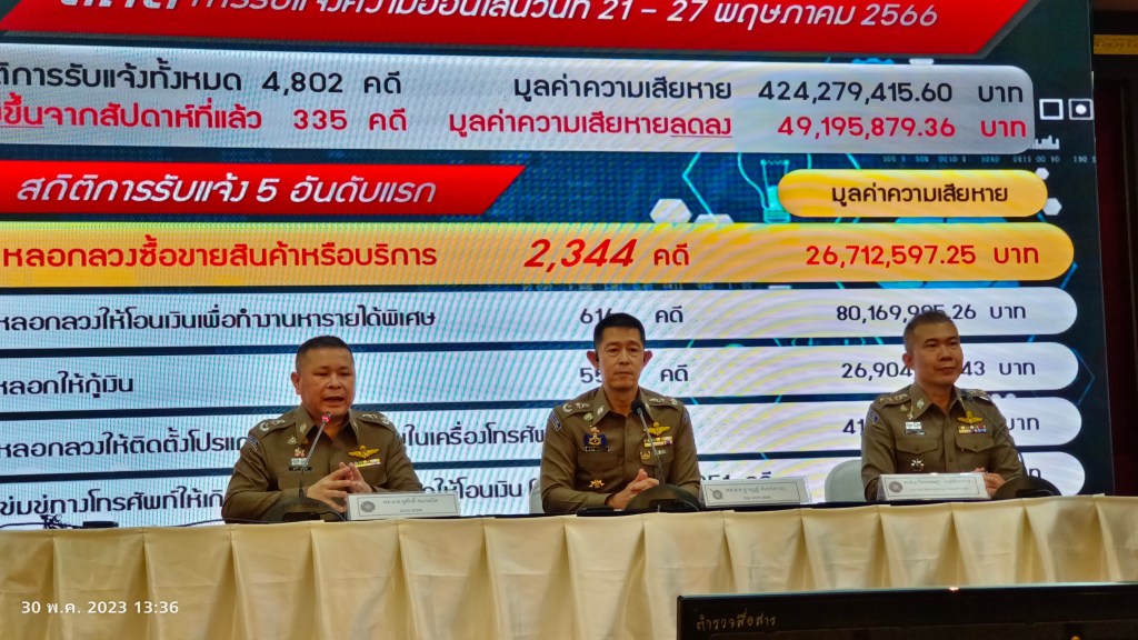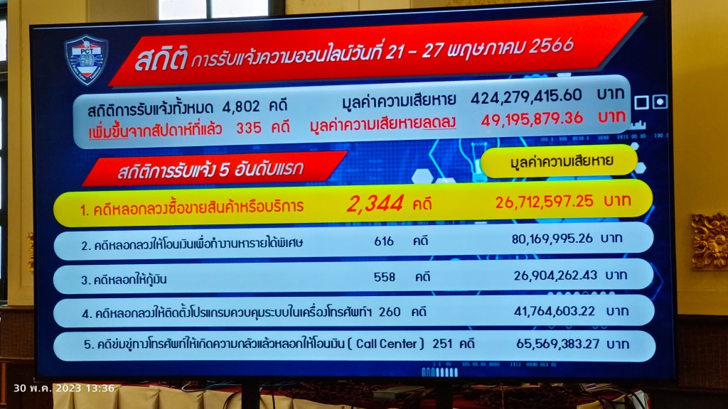พล.ต.อ.สมพงษ์ ชิงดวง ที่ปรึกษาพิเศษ ตร.กล่าวว่าในรอบสัปดาห์ที่ผ่านมา (21-27 พ.ค.2566) มีสถิติการรับแจ้งความคดีออนไลน์มากที่สุด 5 อันดับ ได้แก่ อันดับ 1) คดีหลอกลวงซื้อขายสินค้าหรือบริการ 2) คดีหลอกลวงให้โอนเงินเพื่อทำงานหารายได้พิเศษ 3) คดีหลอกลวงให้กู้เงิน 4) คดีหลอกลวงให้ติดตั้งโปรแกรมควบคุมระบบในเครื่องโทรศัพท์ฯ และ 5) คดีข่มขู่ทางทางโทรศัพท์ให้เกิดความกลัวแล้วหลอกให้โอนเงิน (Call Center) สำหรับคดีออนไลน์ที่มิจฉาชีพนำมาหลอกลวงในช่วงนี้ คือ คดีหลอกลวงให้ติดตั้งโปรแกรมควบคุมระบบในเครื่องโทรศัพท์ฯ โดยใช้วิธีส่งข้อความสั้น (SMS) สวมรอยช่องทางปกติของสถาบันการเงิน หรือหน่วยงานอื่น โดยขยับมาจากอันดับ 6 เป็นอันดับ 4 ซึ่งถือเป็นเรื่องจำเป็นเร่งด่วนต้องย้ำเตือนให้ประชาชนได้รับทราบ
