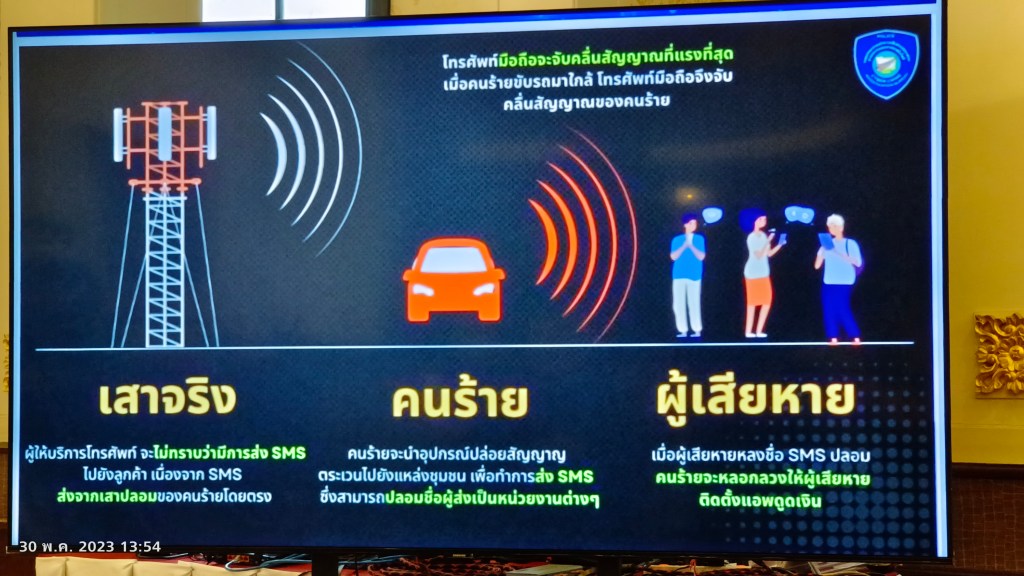 ก่อนหน้านี้มิจฉาชีพแก็งคอลเซ็นเตอร์ส่งข้อความสั้น (SMS) หลอกลวงผู้เสียหายโดยใช้ SIM BOX โทรศัพท์จากต่างประเทศผ่านระบบ VOIP หรือส่งผ่านอีเมลผ่านบริษัทรับส่งข้อความสั้น (SMS) แต่ในรอบเดือนที่ผ่านมา มิจฉาชีพนำเครื่องจำลองสถานีฐาน (False Base Station) ใส่ไว้ในรถขับไปเส้นทางต่างๆ ในเขตกรุงเทพฯและปริมณฑล แล้วส่งสัญญาณไปยังโทรศัพท์มือถือที่อยู่บริเวณใกล้เคียง โดยใช้ชื่อผู้ส่งเป็นสถาบันการเงิน ส่งข้อความสั้น (SMS) ว่า “มีผู้เข้าสู่ระบบธนาคารของผู้เสียหายจากอุปกรณ์อื่น หากไม่ได้ดำเนินการด้วยตนเอง ให้ผู้เสียหายติดต่อธนาคารผ่านลิงก์ไลน์(Line)ทันที” และมีผู้เสียหายหลงเชื่อกดลิงก์เพิ่มเพื่อนไลน์ แล้วคนร้ายจะโทรผ่านไลน์หลอกให้กดลิงก์โหลดแอปพลิเคชันควบคุมเครื่องโทรศัพท์ และโอนเงินออกจาก Mobile Banking ของผู้เสียหาย โดยในห้วงเดือน เม.ย. -พ.ค. 2566 มีการแจ้งความออนไลน์ จำนวน 1,398 เคส รวมมูลค่าความเสียหาย 235,135,988.50 บาท