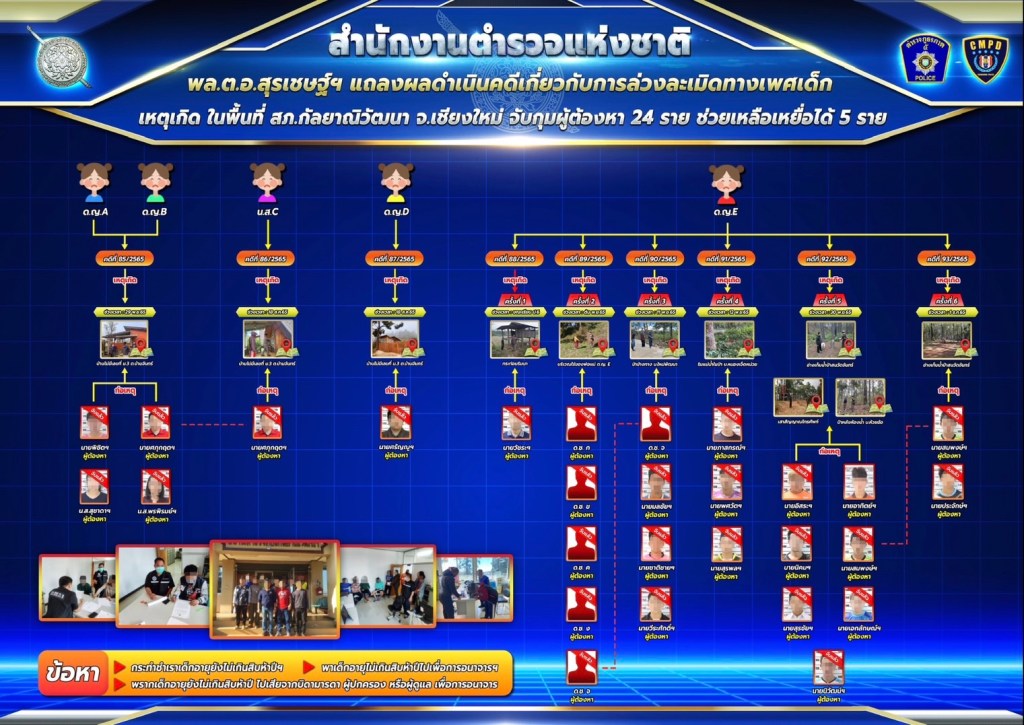 จากกรณีช่วงระหว่างเดือนส.ค. – ธ.ค.65 ที่ผ่านมา ได้มีการเข้าช่วยเหลือเด็กหญิงอายุต่ำกว่า 15 ปี ซึ่งถูกหลอกลวงไปบังคับกระทำชำเรา เหตุเกิดในพื้นที่ สภ.กัลยาณิวัฒนา ภ.จว.เชียงใหม่ ซึ่งเจ้าหน้าที่ตำรวจสามารถช่วยเหลือเด็กได้จำนวน 5 ราย โดย พล.ต.อ.สุรเชษฐ์ ได้สั่งการให้ชุดปฏิบัติการ TICAC ร่วมกับ ภ.5 และ ภ.จว.เชียงใหม่ เร่งขยายผลจับกุมผู้ต้องหาทั้งหมด เจ้าหน้าที่สืบสวนสามารถรวบรวมพยานหลักฐานเพื่อดำเนินคดีกับผู้เกี่ยวข้องทั้งหมดได้จำนวน 9 คดี ผู้ต้องหาทั้งสิ้น 25 ราย มีรายละเอียดดังนี้
