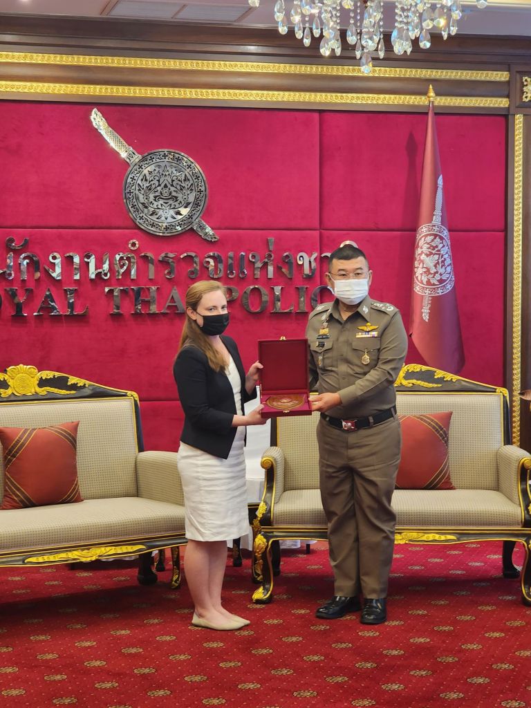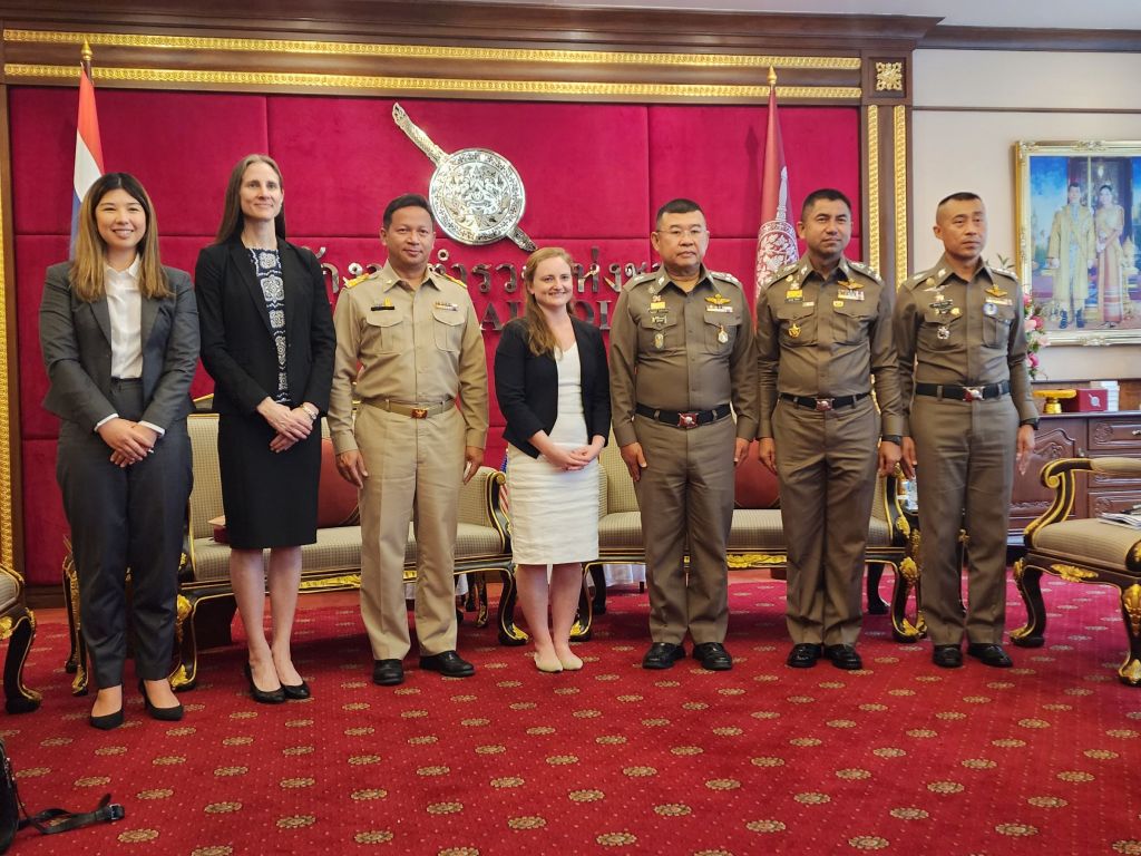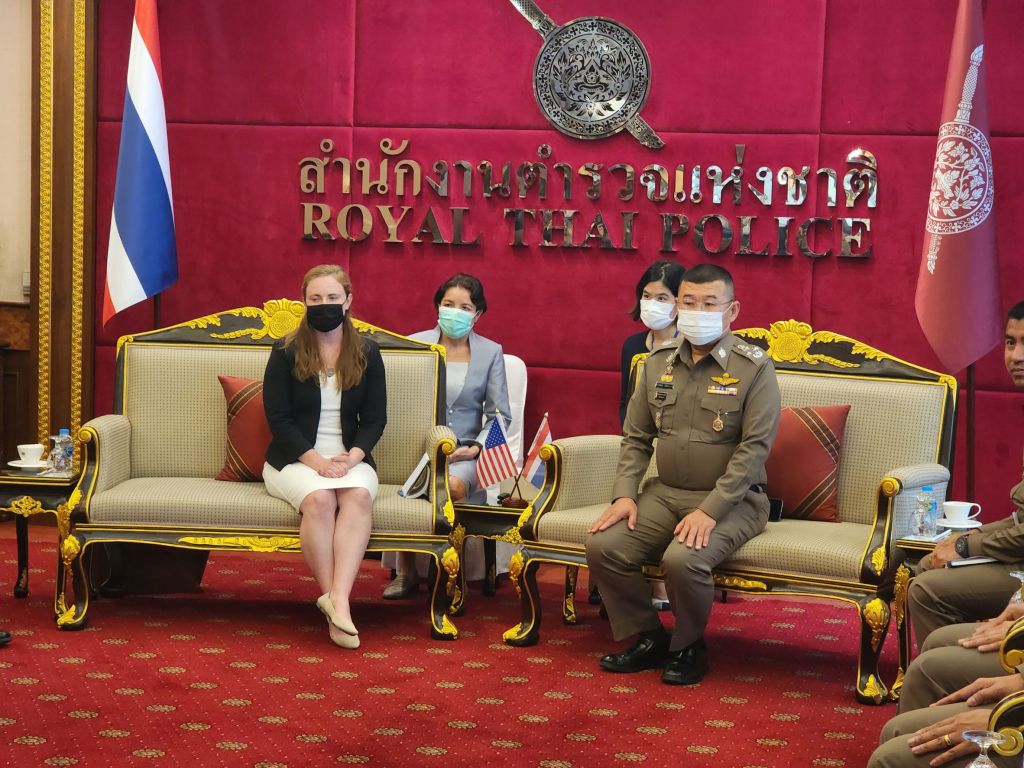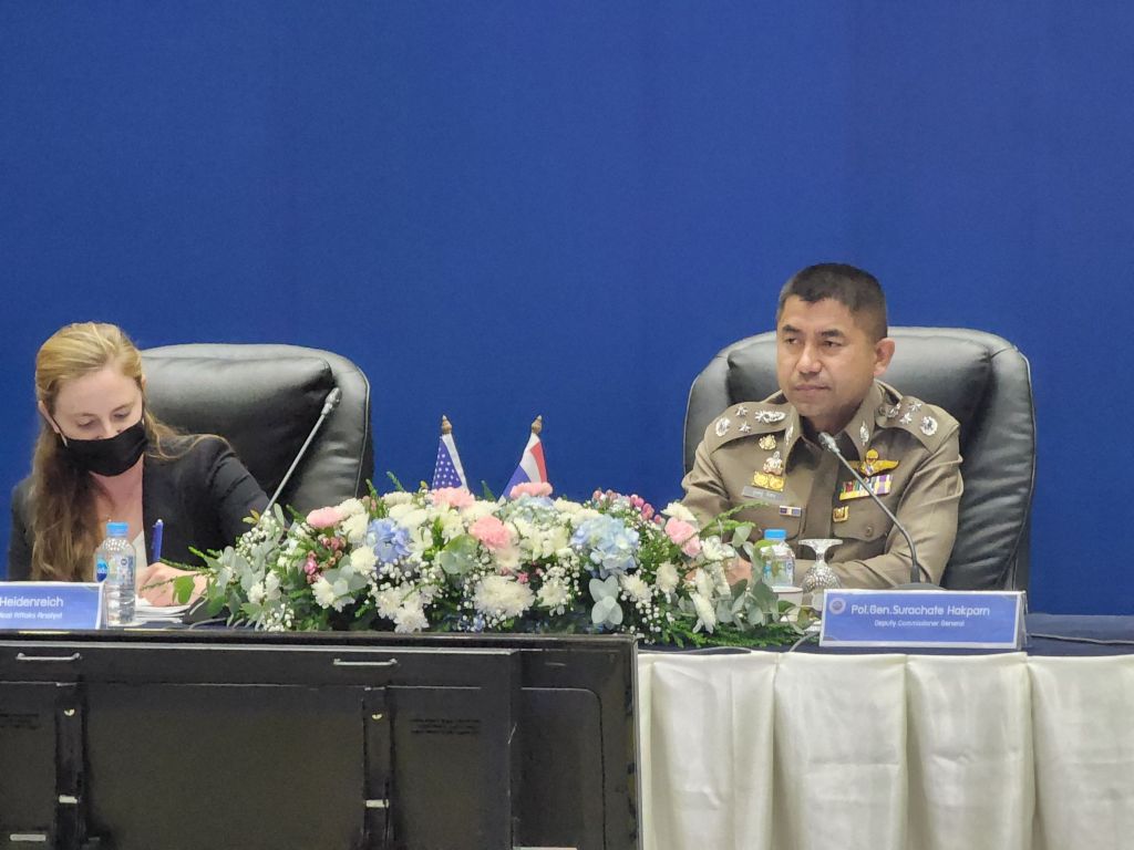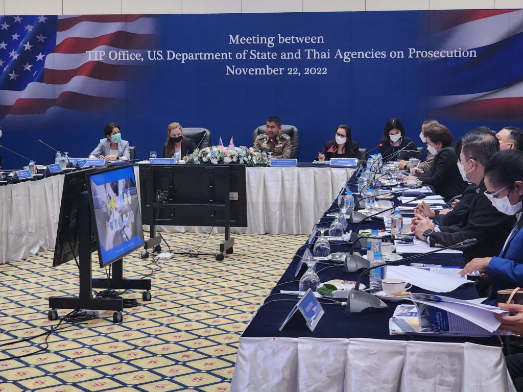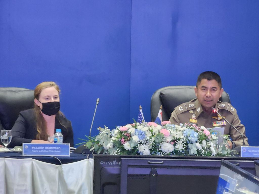 วันนี้ (22 พ.ย.65) เวลา 14.00 น. พล.ต.อ.ดำรงศักดิ์ กิตติประภัสร์ ผบ.ตร. พร้อมด้วย พล.ต.อ.สุรเชษฐ์ หักพาล รอง ผบ.ตร. ในฐานะ ผอ.ศพดส.ตร. พร้อมคณะผู้แทนไทยจากหลายหน่วยงานทั้งจากภาครัฐ เช่น กระทรวงการต่างประเทศ กระทรวงยุติธรรม กระทรวงแรงงาน กระทรวงพัฒนาสังคมและความมั่นคงของมนุษย์ และภาคประชาสังคม เช่น LPN IJM Stella maris และ Hug Project ได้ร่วมกันให้การต้อนรับผู้แทนจากสหรัฐอเมริกา นำโดย น.ส.เคทลีน ไฮเดนรีช เจ้าหน้าที่สำนักงานตรวจสอบและต่อต้านการค้ามนุษย์ พร้อมคณะ ได้ให้เกียรติมาเยี่ยมชม ศูนย์พิทักษ์เด็ก สตรี ครอบครัว ป้องกันปราบปรามการค้ามนุษย์ และภาคประมง สำนักงานตำรวจแห่งชาติ (ศพดส.ตร.) ณ อาคาร 1 สำนักงานตำรวจแห่งชาติ เพื่อเยี่ยมชมและสังเกตการณ์การทำงานของ ศพดส.ตร. หลังจากที่ผลการปฏิบัติด้านการดำเนินคดีมีความก้าวหน้าอย่างก้าวกระโดด จนทำให้ประเทศไทยก้าวขึ้นสู่ Tier 2 จากการประเมิน TIP Report ในปีที่ผ่านมา