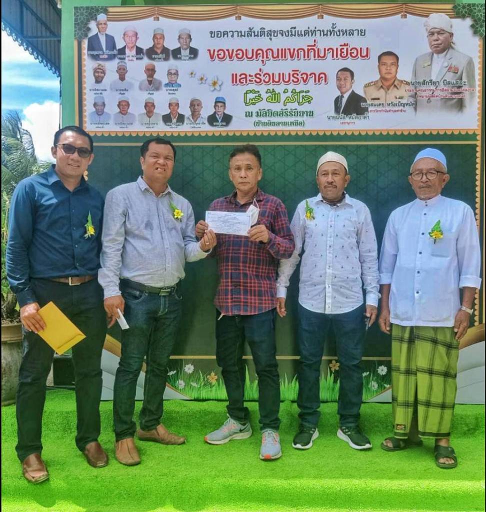 “ฉัตรชัย ปัญญาวุธ “ประธานชมรมนักมวยเก่าจังหวัดสงขลา ยืนกลางเป็นตัวแทน นำเงินที่สมาชิกของชมรมนักมวยเก่าจังหวัดสงขลา ที่ได้ร่วมกันบริจาคไปมอบให้กับ มัสยิดบ้านเหนือ จ.สงขลา ผ่านมาเมื่อเร็วๆ นี้