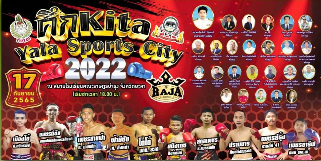 นครยะลา ” ขอเชิญชมรายการมวยดีนัดพิเศษกับศึก”. ดาวรุ่งยะลา เมืองกีฬา ” ณ.สนามมวยชั่วคราวโรงเรียนคณะราษฎร์บำรุงยะลา จังหวัดยะลา ในวันเสาร์ที่ 17 กันยายน 2565 โดยมี ผอ.พรประสิทธิ์ เล็กสุทธิ์ เป็นประธานจัดการแข่งขัน มวยเริ่มทำการแข่งขันตั้งแต่เวลา 18.00น.เป็นต้นไป