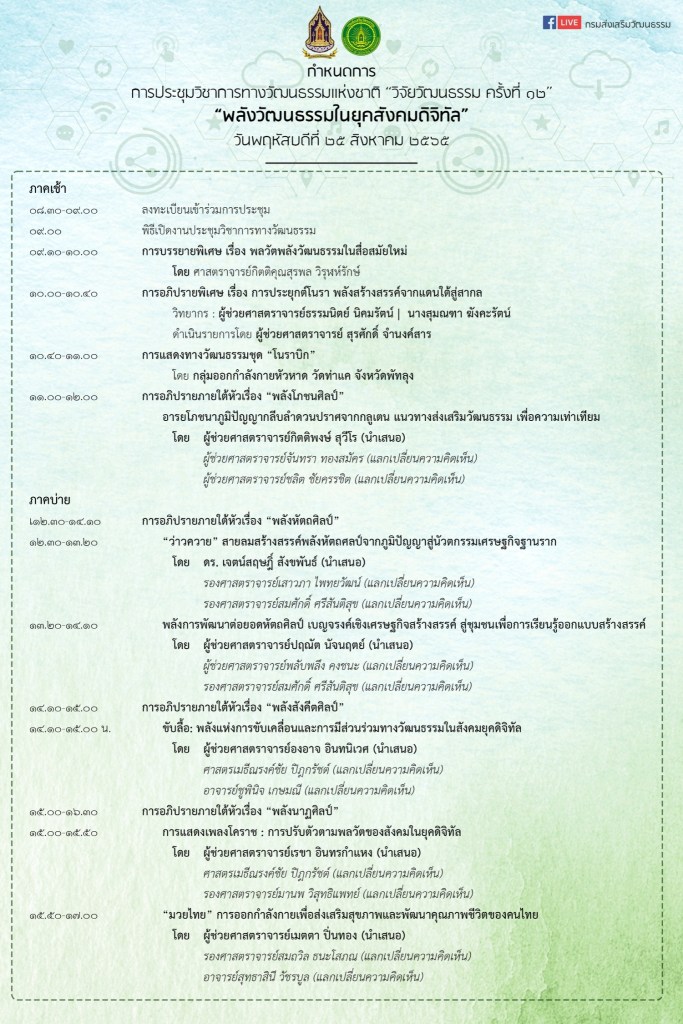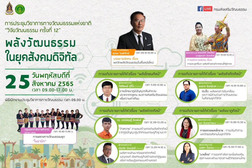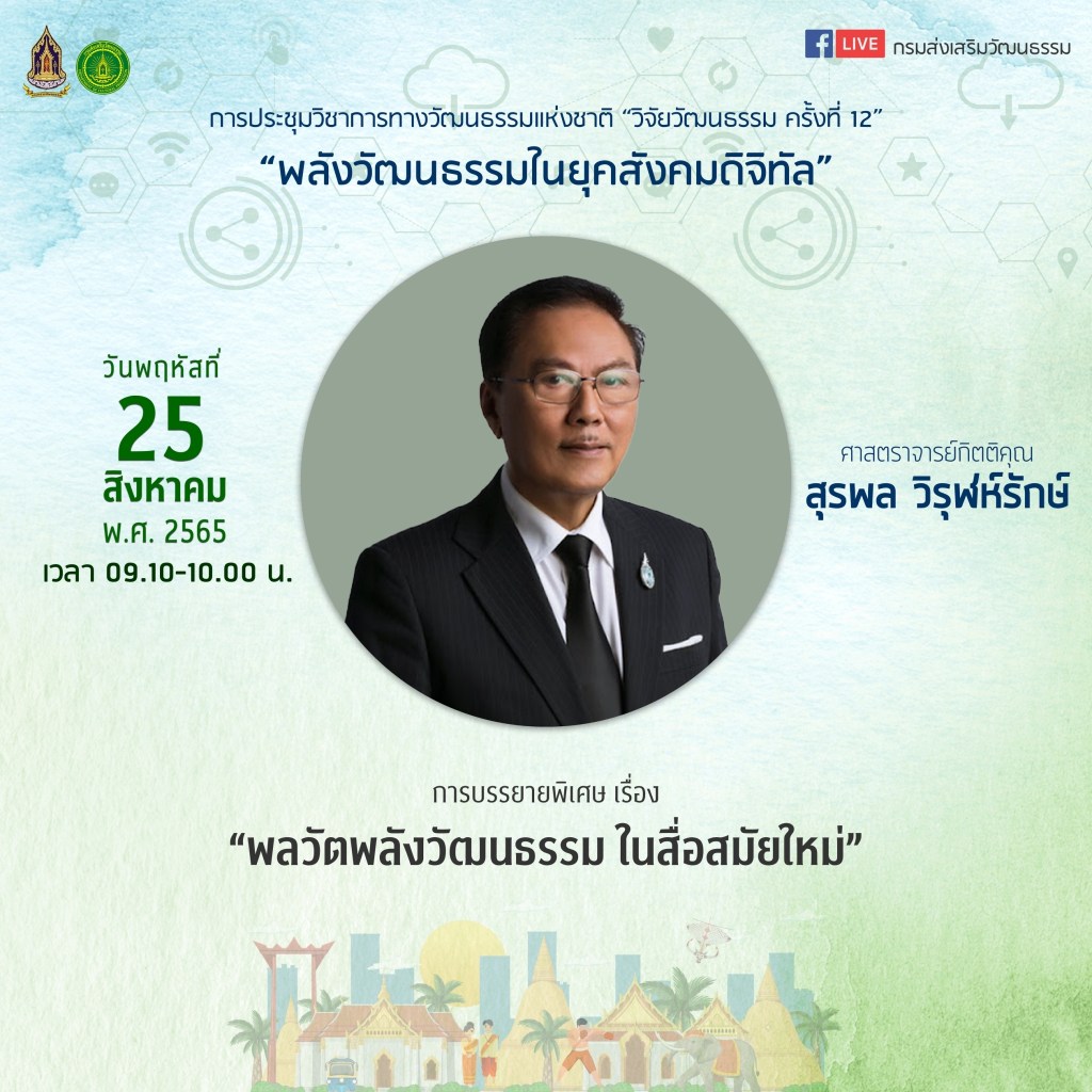 นายอิทธิพล คุณปลื้ม รัฐมนตรีว่าการกระทรวงวัฒนธรรรม (รมว.วธ.) กล่าวปาฐกถาพิเศษ “ทิศทางใหม่ สังคมไทยพลิกวิกฤตเป็นโอกาสได้อย่างไร” และเป็นประธานในพิธีเปิดงาน “สมัชชาคุณธรรมแห่งชาติ ครั้งที่ ๑๒” ภายใต้แนวคิด “Sustainability with Moral: อยู่รอด อยู่ร่วม สังคมไทยเป็นสุขอย่างยั่งยืน” ในรูปแบบไฮบริดออนไลน์ โดยมี รองศาสตราจารย์ นายแพทย์สุริยเดว ทรีปาตี ผู้อำนวยการศูนย์คุณธรรม (องค์การมหาชน) ผู้บริหาร และผู้แทนภาคีเครือข่ายสมัชชาคุณธรรม เข้าร่วม ณ หอศิลป์แห่งชาติ กระทรวงวัฒนธรรม ถนนเทียมร่วมมิตร แขวงห้วยขวาง เขตห้วยขวาง กรุงเทพมหานคร