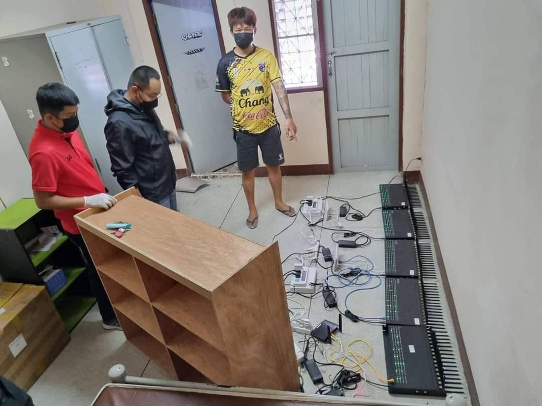 กองบัญชาการตำรวจสืบสวนสอบสวนอาชญากรรมทางเทคโนโลยี และกองพิสูจน์หลักฐานกลาง จึงได้นำกำลังเข้าตรวจค้น จำนวน 9 จุด ในพื้นที่เขตบางนา ห้วยขวาง และลาดพร้าว ซึ่งเป็น “จุดที่ใช้ส่งสัญญาณโทรศัพท์มือถือสำหรับโทรมาหลอกลวงประชาชน”